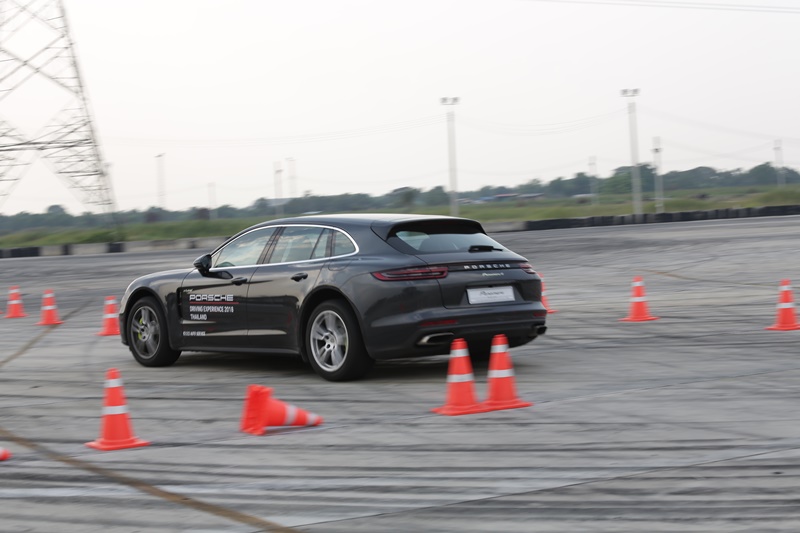 เราขับรถเข้าประจำจุดสตาร์ทแล้วเหยียบคันเร่งลึกที่สุด ไม่ต้องบอกว่าอัตราเร่งของ Sport Turismo จะรุนแรงขนาดไหนเพราะพละกำลัง 462 แรงม้า กับแรงบิด 700 นิวตันเมตรดึงให้หลังติดเบาะในพริบตา เมื่อถึงจุดเบรกเราเหยียบเบรกเต็มแรงแล้วหักซ้ายและหักขวาตามทางที่กรวยตั้ง การเบรกที่ความเร็วสูงแล้วต้องหักหลบกะทันหันไม่ทำให้รถเสียการควบคุมแต่อย่างใด ขณะเดียวกันไฟกระพริบฉุกเฉินก็จะทำงานโดยอัตโนมัติ
