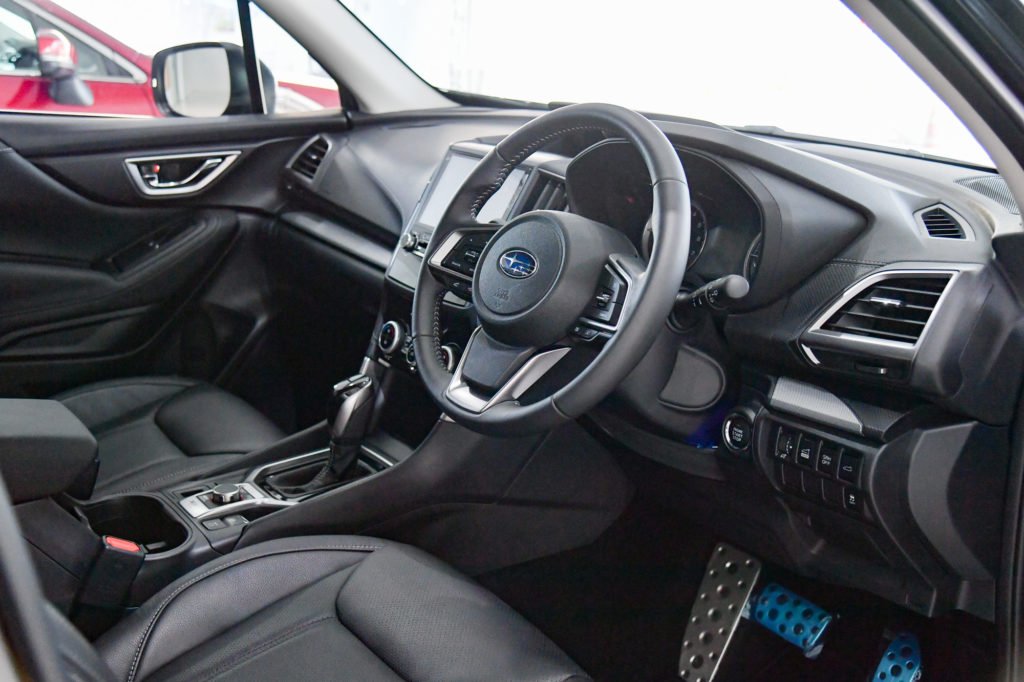 จบเรื่องราวของดีไซน์ภายนอก เปิดประตูเข้ามาข้างในก็จะพบกับกลิ่นอายของความเป็นอนุรักษณ์นิยม ห้องโดยสารมีความโปร่งโล่ง เพดานหลังคาสูง พื้นที่เบาะหน้าและเบาะหลังกว้างขวาง ไม่ว่าคุณจะมีขนาดตัวเท่าไรก็สามารถใช้ชีวิตไปกับ Forester ได้อย่างไม่อึดอัด เบาะคู่หน้าปรับไฟฟ้า กระจกแต่ละบานขนาดใหญ่เบิ้มให้อารมณ์เหมือนรถกระบะ เบาะนั่งเป็นวัสดุหนังสังเคราะห์ซึ่งจะไม่นุ่มสบายเท่าหนังแท้อยู่แล้ว แต่เบาะยังมีรูปทรงที่โอบกระชับดี เราสังเกตว่าภายในมีพลาสติกแข็งจำนวนมาก จุดนี้ถ้าใครซีเรียสเรื่องความพรีเมี่ยมอาจไม่ปลื้มแต่คุณภาพการประกอบถือว่าแน่นหนาดีมาก