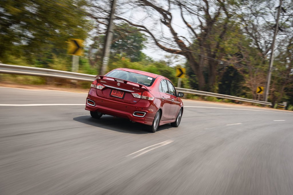 ช่วงล่างของ Ciaz RS ให้ความมั่นใจในการขับความเร็วสูงได้ดี ขับทางตรงค่อนข้างเกาะถนน ไม่ส่าย ไม่โคลง และยังดูดซับแรงสะเทือนจากเส้นหรือรอยปะได้ดี เมื่อเจอโค้งก็ยังคงรักษาการทรงตัวได้ดี ไม่ยวบย้วย ไม่โยนมากจนเกินไป ขณะที่พวงมาลัยก็มีน้ำหนักมากขึ้นเมื่อใช้ความเร็วสูงแต่ยังมีความแม่นยำและควบคุมง่าย