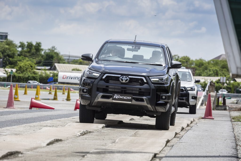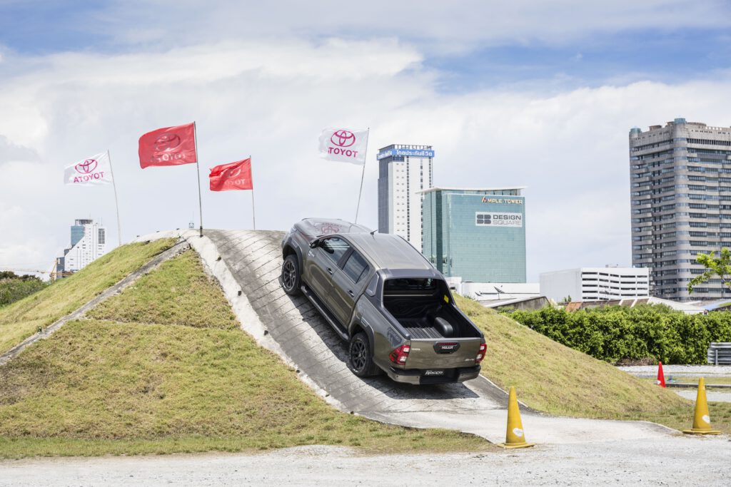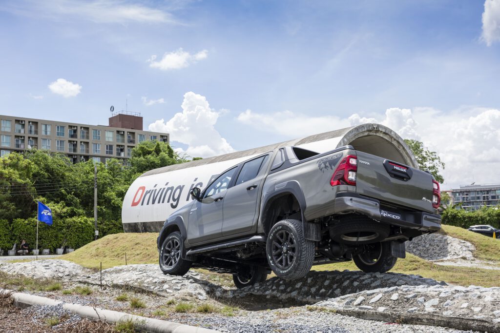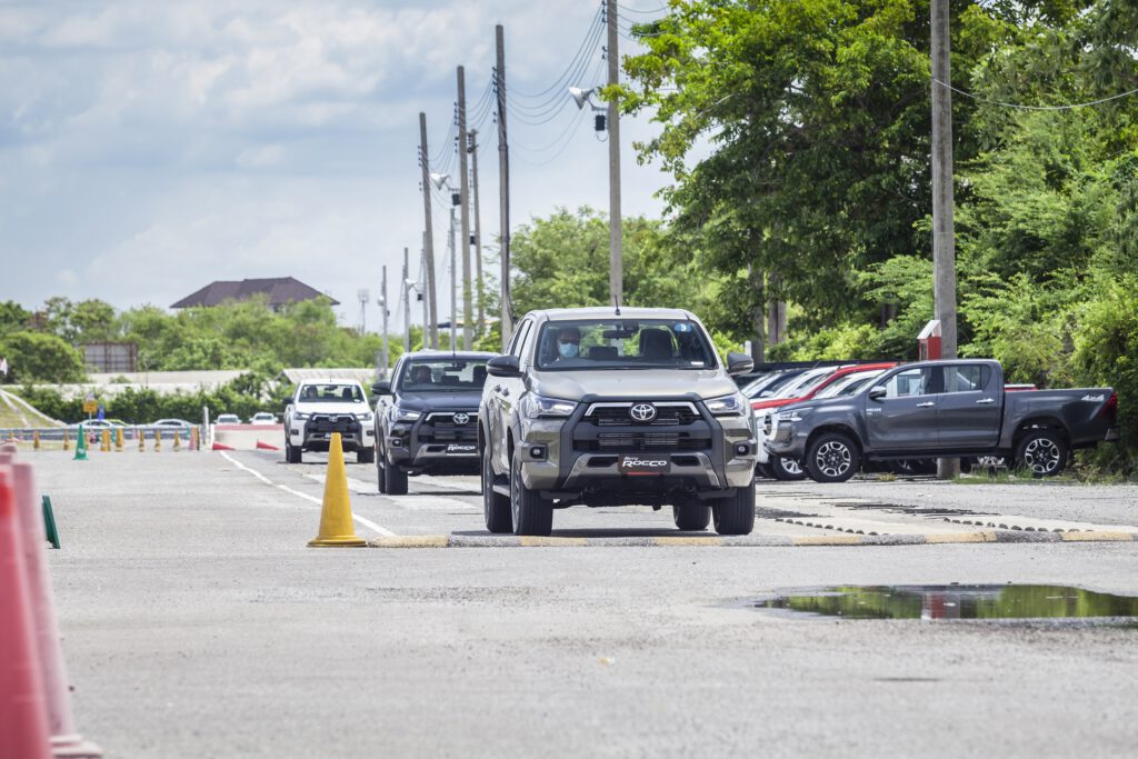 สถานี Off Road หลัก ๆ จะมี 2 สถานี คือ ภูเขาจำลองสูง 5 เมตร ความชัน 43 องศา และสถานีเนินสลับ ด้วยกำลังเครื่องยนต์ 204 แรงม้า แรงบิด 500 นิวตันเมตร เนินแค่นี้สบายๆ สำหรับ Revo Rocco เพียงแค่ใช้เกียร์ต่ำ ใช้รอบต่ำ ค่อยๆ เดินคันเร่งช้าๆ เบาๆ รถก็ไหลขึ้นเนินได้อย่างง่ายดาย ประกอบกับการมีระบบช่วยออกตัวบนทางลาดชัน HAC ที่ทำงานไวขึ้นก็ช่วยในการขับขึ้นเนินชันเป็นเรื่องง่ายและปลอดภัยขึ้น ขาลงเนินก็ง่ายดาบด้วยระบบควบคุมความเร็วขณะลงทางชัน DAC คอยช่วยควบคุมความเร็ว รถจะค่อยๆ ไหลลงเนินอย่างช้าๆ เพื่อความปลอดภัย