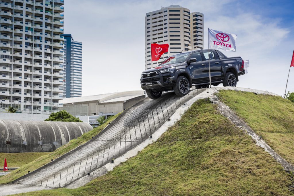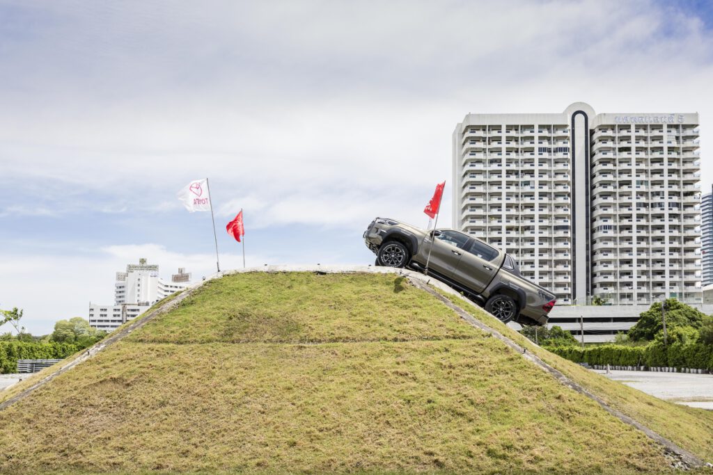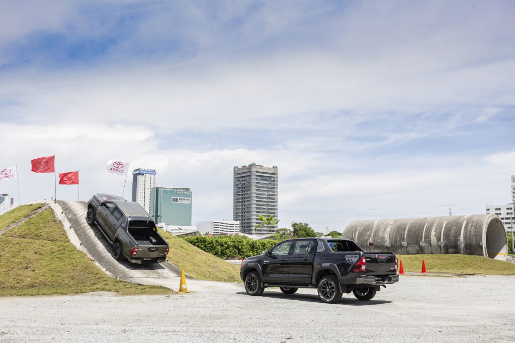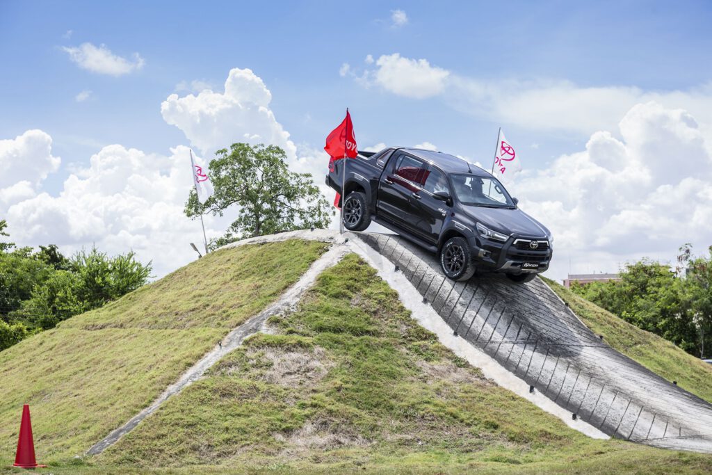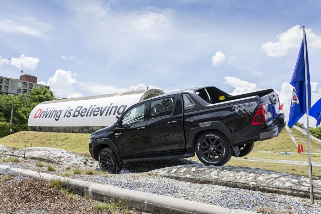 สถานี Off Road หลัก ๆ จะมี 2 สถานี คือ ภูเขาจำลองสูง 5 เมตร ความชัน 43 องศา และสถานีเนินสลับ ด้วยกำลังเครื่องยนต์ 204 แรงม้า แรงบิด 500 นิวตันเมตร เนินแค่นี้สบายๆ สำหรับ Revo Rocco เพียงแค่ใช้เกียร์ต่ำ ใช้รอบต่ำ ค่อยๆ เดินคันเร่งช้าๆ เบาๆ รถก็ไหลขึ้นเนินได้อย่างง่ายดาย ประกอบกับการมีระบบช่วยออกตัวบนทางลาดชัน HAC ที่ทำงานไวขึ้นก็ช่วยในการขับขึ้นเนินชันเป็นเรื่องง่ายและปลอดภัยขึ้น ขาลงเนินก็ง่ายดาบด้วยระบบควบคุมความเร็วขณะลงทางชัน DAC คอยช่วยควบคุมความเร็ว รถจะค่อยๆ ไหลลงเนินอย่างช้าๆ เพื่อความปลอดภัย