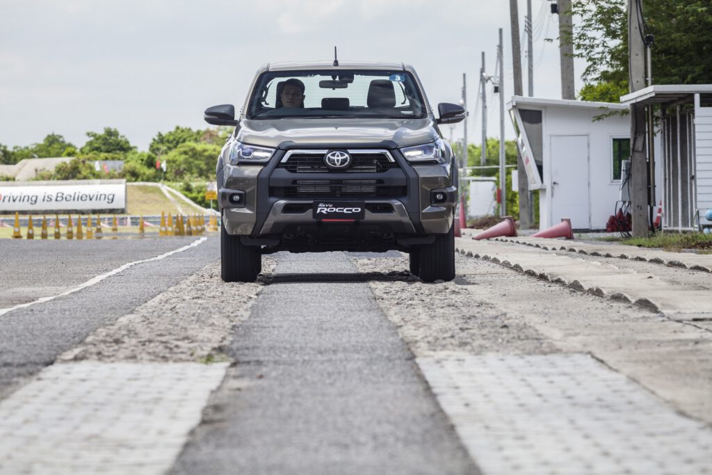 สุดท้ายเป็นสถานีทดสอบความนุ่มนวลของระบบกันสะเทือนด้วยการขับขึ้น-ลงเนิน รถมีการดูดซับแรงกระแทกไดดีขึ้นเมื่อเทียบกับรุ่นก่อน จังหวัลงเนินก็ไม่กระเด้งกระดอนมากจนเกินไป ต่อด้วยการขับผ่านพื้นผิวขรุขระที่ความเร็ว 30 กม./ชม. จุดนี้ชัดเจนว่ารถดูดซับแรงสะเทือนได้ดีขึ้น ไม่ส่งแรงสะเทือนขึ้นมาบนห้องโดยสารมากเกินไป โดยรวมแล้ว Revo Rocco ใหม่ทำได้ดีขึ้นในด้านการป้องกันแรงสะเทือน