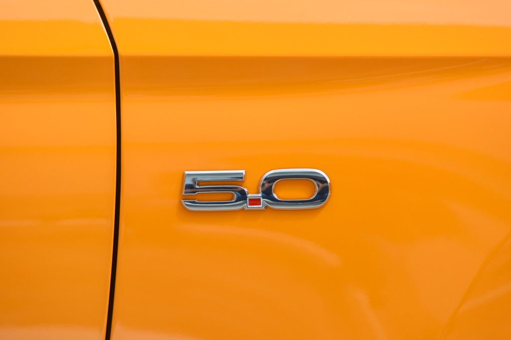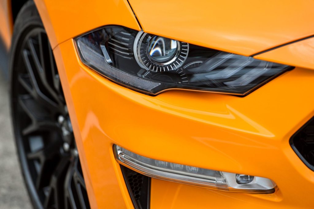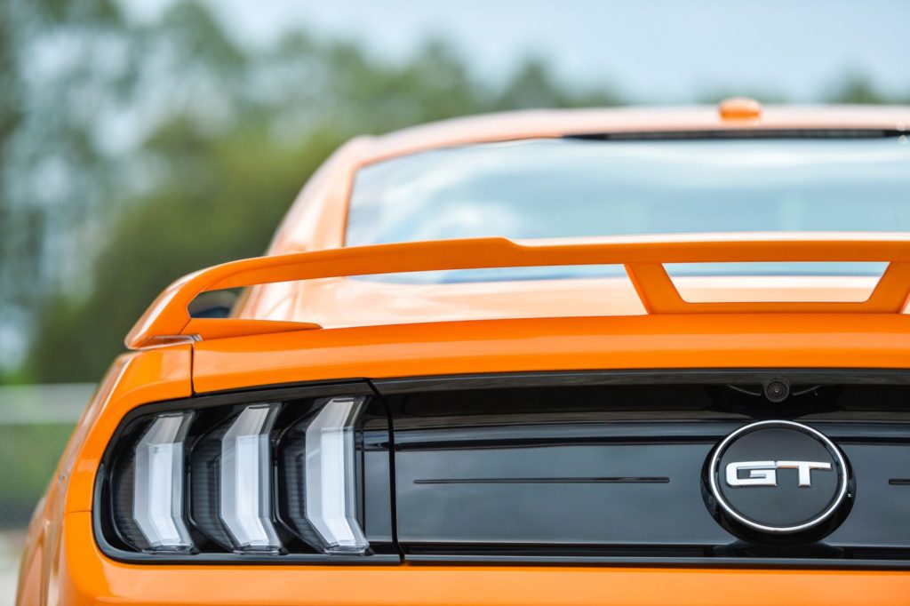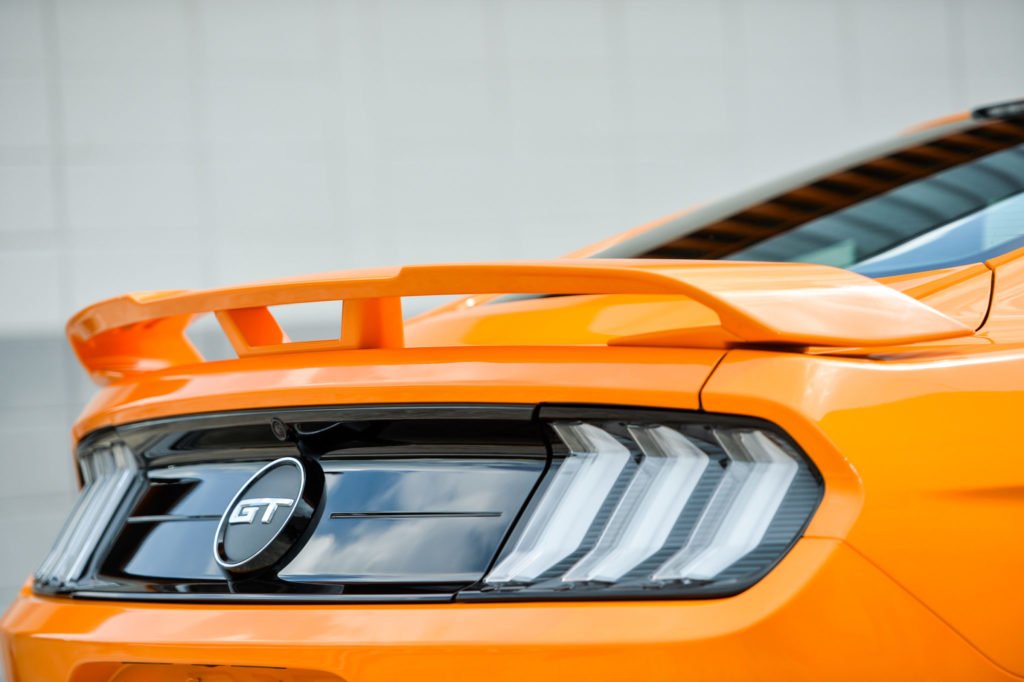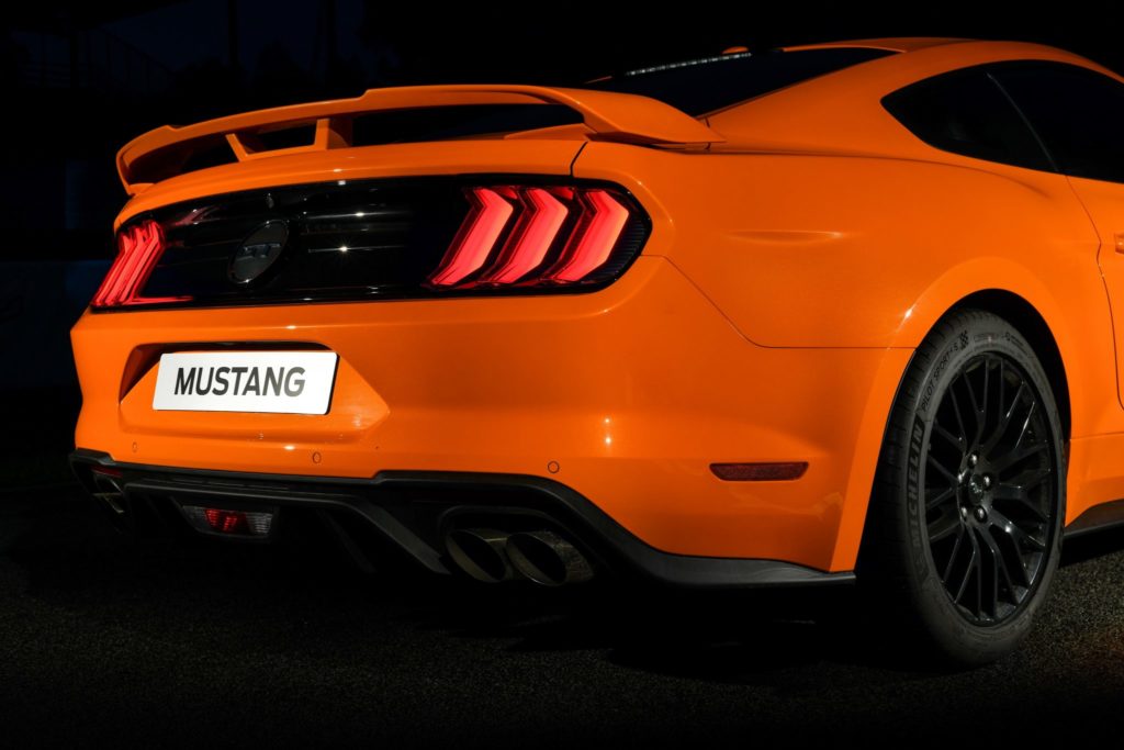 เอกลักษณ์ที่สืบทอดมตั้งแต่ Mustang รุ่นแรก ปี 1964 คือ ไฟท้าย 3 แถบ และโลโก้ม้าวิ่งที่ใช้เหมือนกันใน Mustang ทุกเจนเนอเรชัน ไฟหน้าเป็นแบบ LED Projector ไฟเดย์ไทม์ รันนิ่ง ไลท์, ไฟเลี้ยว และไฟท้ายจะเป็น LED ทั้งหมด มีระบบเปิด-ปิดไฟหน้าอัตโนมัติ กันชนหลังและดิฟฟิวเซอร์แบบใหม่ช่วยเพิ่มความโฉบเฉี่ยวให้กับด้านท้าย ในรุ่น GT มาพร้อมท่อไอเสีย 4 ท่อ และสปอยเลอร์หลังเป็นมาตรฐาน