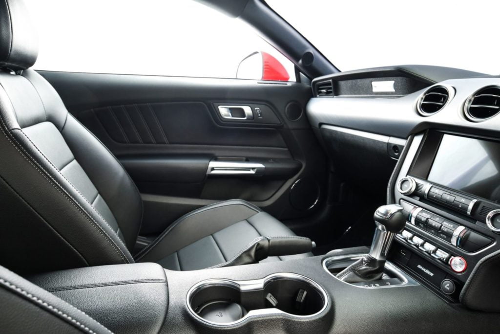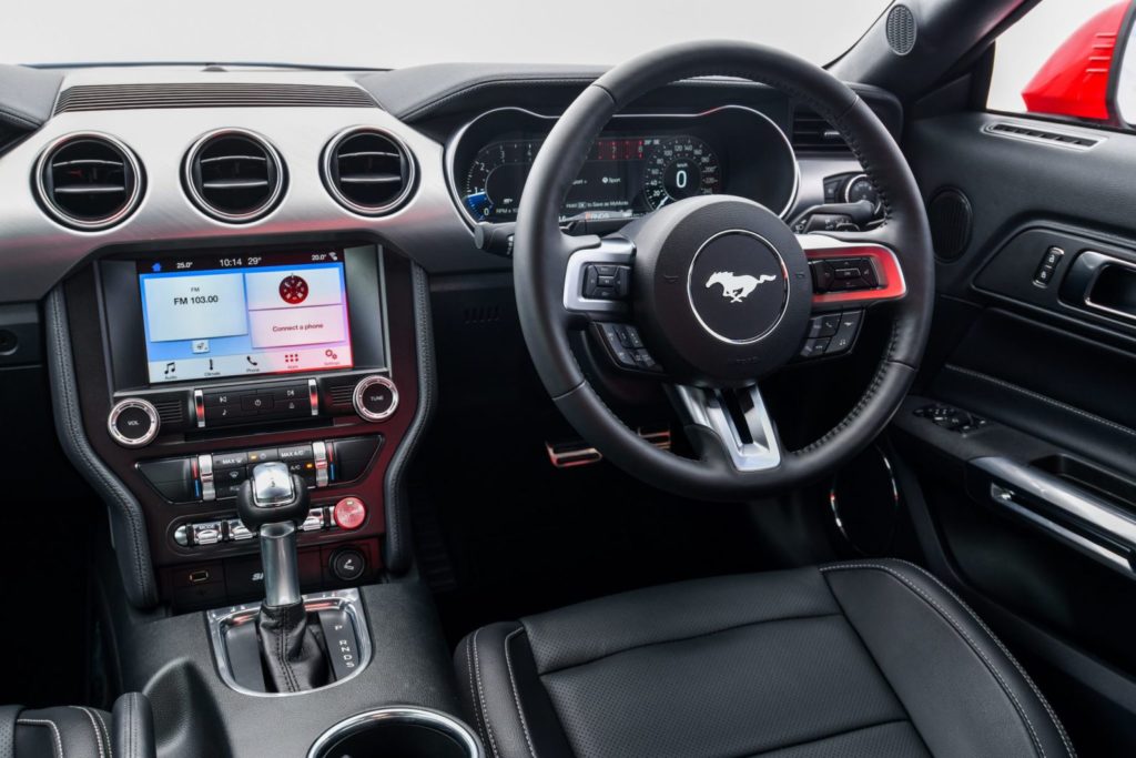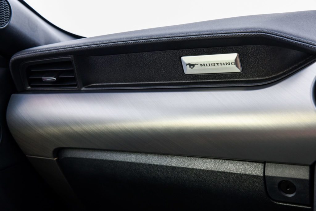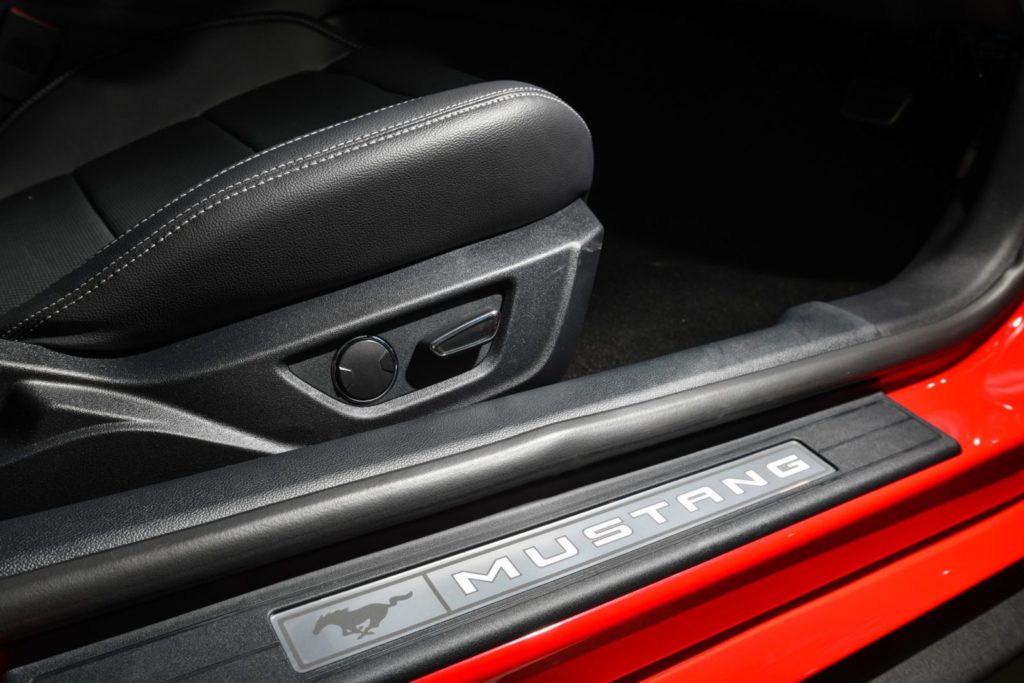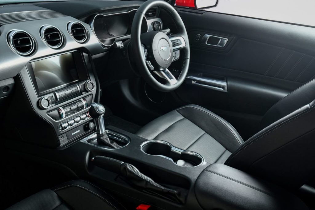 ภายในห้องโดยสารของ Mustang ได้รับการออกแบบให้มีความดิบ แข็งแกร่ง และทรงพลัง ตกแต่งด้วยวัสดุบุนุ่มตลอดแนวประตู และชิ้นส่วนอะลูมิเนียม พวงมาลัยเป็นแบบสปอร์ต 3 ก้านพร้อมแพดเดิลชิฟท์ เบาะนั่งให้มาเป็นแบบสปอร์ตหุ้มหนัง Ebony สีดำปรับไฟฟ้า 6 ทิศทาง อุปกรณ์มาตรฐานมีระบบปรับอากาศอัตโนมัติแยกซ้ายขวา ไฟตกแต่งห้องโดยสาร Ambient Light และชายบันไดสแตนเลสเรืองแสง LED