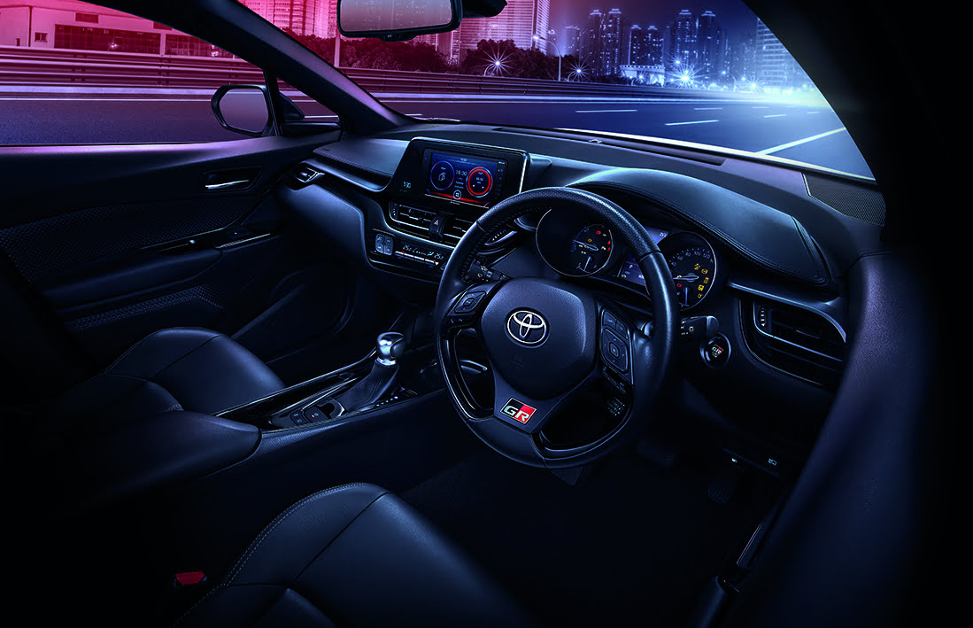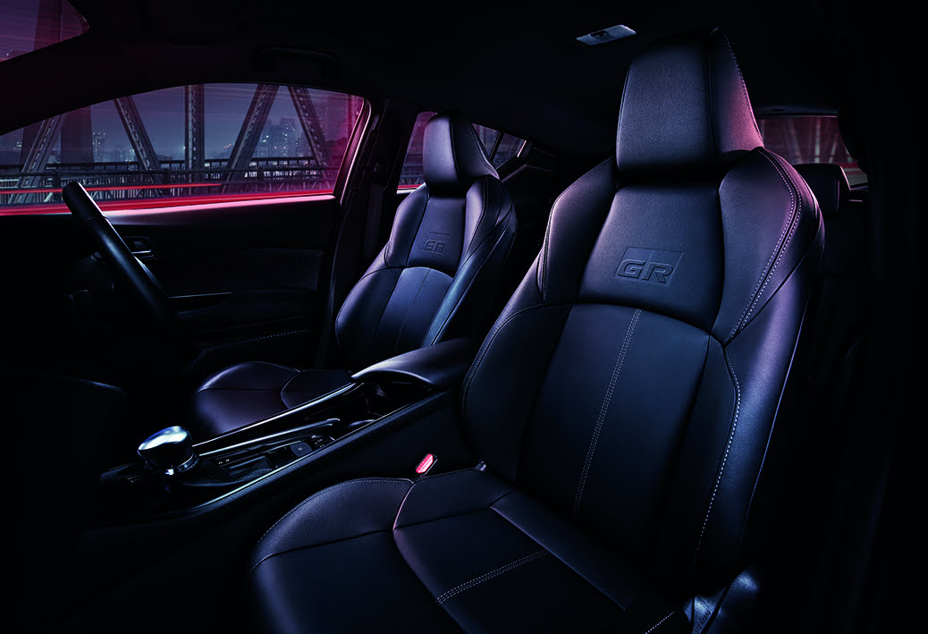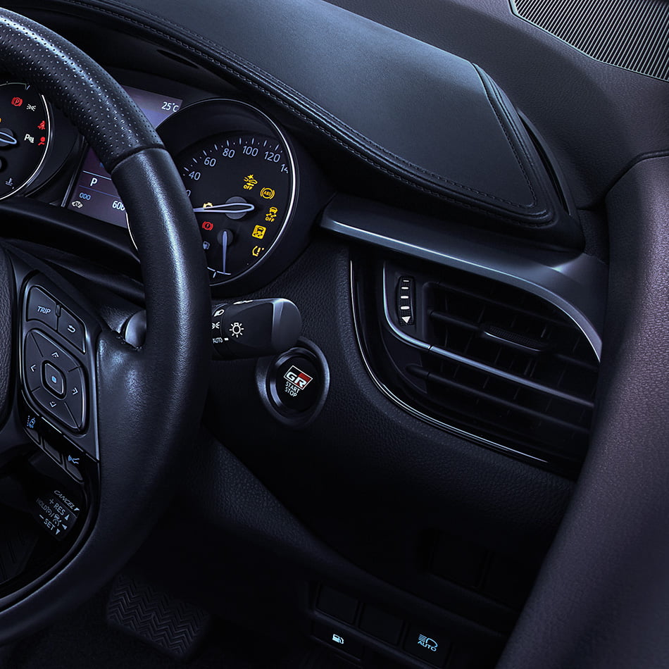 ดีไซน์ภายในตกแต่งด้วยสีดำ Total Look และสี Gun Metallic สปอร์ตเข้มเต็มสไตล์ GR เบาะนั่งดีไซน์พิเศษ เดินด้ายสีเทาสุดเท่ โดดเด่นด้วยสัญลักษณ์ GR มาพร้อมพวงมาลัยหุ้มหนังแบบเจาะรูพร้อมสัญลักษณ์ GR และ Push Start ระบบสตาร์ทอัจฉริยะ พร้อมสัญลักษณ์ GR