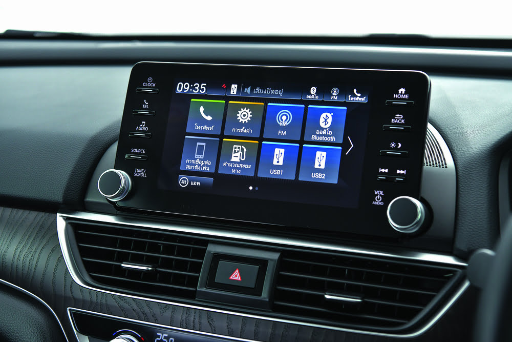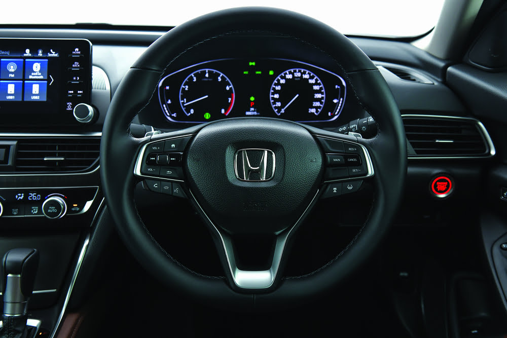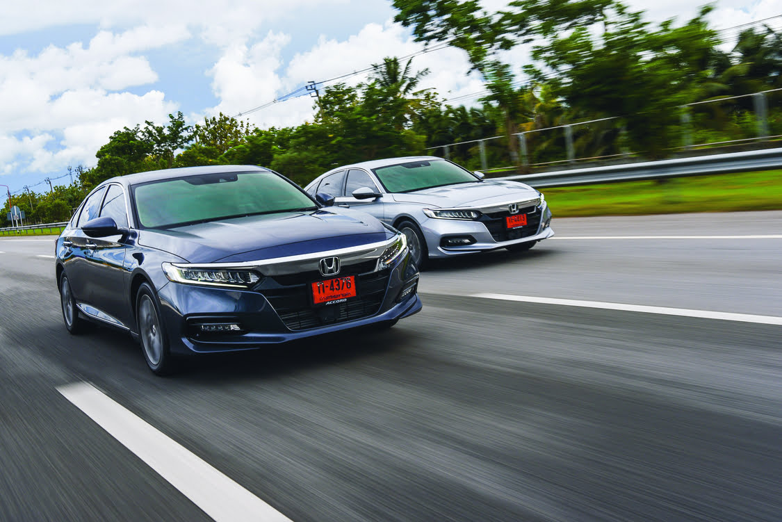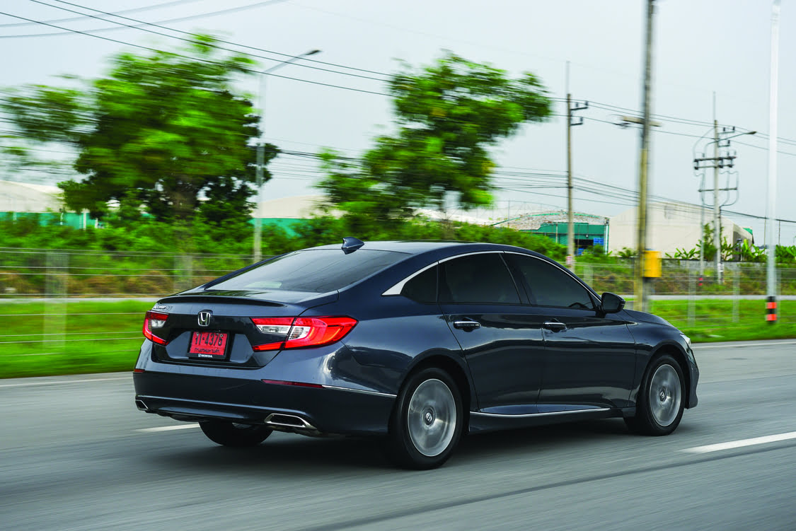 ไปที่โหมด sport กันบ้าง หน้าจอมาตรวัดต่าง ๆ ก็จะเปลี่ยนเป็นสีแดงเพื่อให้ดูสปอร์ตมากขึ้น พร้อมกับอักษร sport ซึ่งเรากำลังขับในทางตรง สังเกตได้เลยว่ารอบมาได้เร็วขึ้น เสียงและพละกำลังมีมากขึ้น ถือว่ารอบมาค่อนข้างไวเพราะว่าเครื่องยนต์ตัวนี้ให้แรงม้ามากกว่าซีวิคและไม่อืดเมื่อเทียบกับน้ำหนักของตัวรถ ถ้าขับไกล ๆ น่าจะสนุกแต่อัตราสิ้นเปลืองก็มากหน่อย หากเราขับในโหมดนี้บ่อย ๆ ก็จะอยู่ที่ 8-9 ลิตร/กม. ถัดมาในเรื่องของวงเลี้ยว ซึ่งวงเลี้ยวแคบทำให้เลี้ยวง่าย ส่วนพวงมาลัยเป็นแบบไฟฟ้า ไม่แตกต่างจากรุ่นท็อปเลย โดยที่พวงมาลัยไม่ได้เบามากแต่ก็ไม่ได้หนักจนรู้สึกเมื่อย ถ้าขับความเร็ว 120 กม. จะรู้สึกหวิวนิดหน่อยแต่ก็มีความนิ่ง ส่วนช่วงล่างจะกระเด้งกว่ารุ่นท็อป โดยที่เราได้ลองนั่งข้างหลังมาสักระยะ ให้ความรู้สึกโยนพอสมควรถ้าคนขับรถขับเร็ว ๆ อาจจะเวียนตัวได้ เราคิดว่ารถคันนี้ตอบโจทย์กับผู้บริหารที่ต้องการขับรถเองเป็นหลักแต่ถ้าต้องการความเร็วต้น ๆ รอบมาไว ก็ต้องเป็นรุ่นท็อปเพราะรอบในช่วงต้นตอบสนองได้ไว ในรุ่นนี้มาไวแต่ช้าก็กว่า อัตราบริโภคน้ำมันเราคิดว่าจะไม่เป็นปัญหาเพราะกลุ่มตลาดของ Accord ไม่ใช่กลุ่มที่จะกังวลเรื่องค่าใช้จ่ายแต่จะเป็นเรื่องของความสนุกและการใช้งานมากกว่าว่า