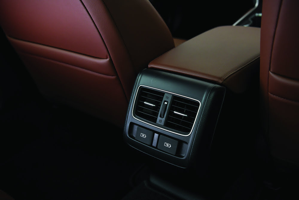 ต่อไปเราจะไปดูส่วนควบคุมต่าง ๆ ซึ่งปุ่มเปิดปิดหรือควบคุมต่าง ๆ เป็นแบบปุ่มกด โดยที่แอร์สามารถแยกปรับอิสระซ้ายขวาได้ นอกจากนี้ยังมีปุ่ม Sync อุณหภูมิให้เท่ากับฝั่งคนขับด้วย มีตัวไล่ฝ้ากระจกด้านหน้า ในส่วนระบบสาระบันเทิงเป็นจอทัชสกรีนขนาดใหญ่ซึ่งสามารถเปิดโหมดกลางคืนเพื่อไม่ให้แสบตาได้ รวมไปถึงสามารถปรับระดับความเข้มของแสงได้ มีกระจกมองหลังเป็นกระจกปรับแสงอัตโนมัติซึ่งเป็นส่วนที่เราชื่นชอบเพราะจะช่วยทำในเรื่องการมองกระจกหลังในเวลากลางคืนทำให้ไม่แสบดวงตา พวงมาลัยเป็นแบบสปอร์ต 3 ก้าน วัสดุเป็นหนังอย่างดีจับแล้วกระชับมือ เป็นพวงมาลัยมัลติฟังก์ชั่นโดยที่ด้านซ้ายสำหรับควบคุมคอนโทล รับ-วางสายโทรศัพท์และยังมีปุ่มสั่งการด้วยเสียงซึ่งจะไปเชื่อมต่อกับ Apple CarPlay เป็นการสั่งการด้วย siri มีปุ่มเพิ่ม-ลดเสียง มาถึงด้านขวาของพวงมาลัยเป็นปุ่มควบคุมระบบความปลอดภัยต่าง ๆ เช่น ระบบควบคุมพวงมาลัยเมื่ออกนอกเลน ระบบ Curise Control ในส่วนด้านหลังของพวงมาลัยมี Paddle Shift เอาไว้ใช้เป็นโหมด manual ซึ่งรุ่นนี้ไม่มีตัวแสดงผลที่กระจกเหมือนรุ่นท็อป เบาะเป็นสีน้ำตาลหากตัวรถเป็นสีเข้ม แต่ถ้าเป้นสีอ่อนภายในจะเป็นสำซึ่งจะตัดกับตัวรถ นอกจากนี้ยังมี wireless charger มาให้ด้วย