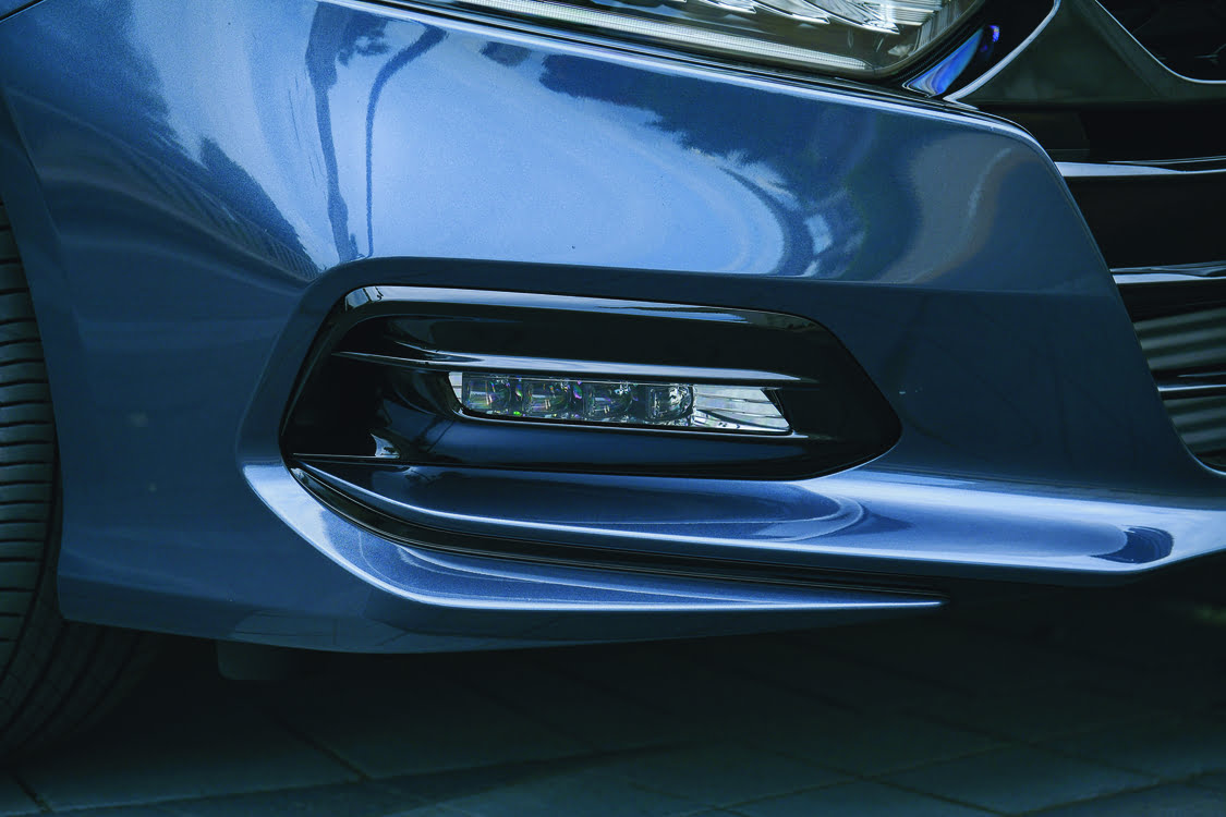 เริ่มต้นที่กระจังหน้า ดีไซน์ยังคงคล้ายเดิมแต่ดูดุดันขึ้น ตัวโลโก้ฮอนด้าแตกต่างจากฮอนด้าเครื่องยนต์ไฮบริด นอกจากนี้ยังไม่มีกล้องมองหน้ามาให้และเซนเซอร์ก็ไม่มีมาให้ทั้งด้านหน้า รวมถึงด้านหลังด้วย ในส่วนของไฟ Honda Accord 1.5 Turbo EL 2021 เป็น Full LED เต็มระบบ มีไฟ Day time running และเพิ่มไฟตัดหมอกมาให้ซึ่งเป็นแอลอีดีเช่นกันโดยที่ในรุ่นก่อนหน้าที่ยังไม่ได้ปรับปรุงนั้นไม่มีมาให้ ล้อแม็กขนาด17 นิ้ว ลายแต่กต่างอย่างสิ้นเชิงกับตัวท็อป ตัวนี้จะดูเป็นตรงมากกว่าซึ่งตัวท็อปจะดูโฉบเฉี่ยวมากกกว่าเพราะเป็นรูปใบพัด แต่ก็รุ่นนี้ก็สวยเช่นกัน ยางใช้ขนาด 225/50 R17 ซึ่งขอบจะหนากว่าตัวท็อป ฟิลลิ่งการขับขี่ก็จะต่างกันแต่ไม่น่าจะต่างกันมากเท่าไหร่