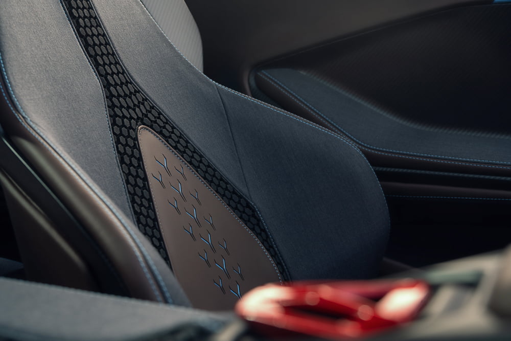 งานตกแต่งภายในใช้วัสดุที่ยั่งยืนซึ่งผลิตในอิตาลีเกือบทั้งหมด บริเวณแผงหน้าปัด เบาะนั่ง และแผงประตู ได้รับการตกแต่งด้วยผ้าขนแกะเมอริโนคุณภาพสูง (จากบริษัทสัญชาติอิตาลีที่ผ่านมาตรฐาน B Certified) ส่วนด้ายย้อมสีทำจากวัสดุรีไซเคิล ทั้งไนลอน/พลาสติกรีไซเคิล รวมถึงวัสดุที่ไม่ใช่พลาสติกอีกหลายชนิด เช่น โฟมในส่วนเบาะนั่งแนวสปอร์ตทำจากเส้นใยรีไซเคิลซึ่งผลิตด้วยกรรมวิธีการพิมพ์ 3 มิติ แม้แต่เส้นใยคาร์บอนที่นำมาใช้ร่วมกันในหลายส่วน เช่นคอนโซลกลางและแผงประตู ก็ทำมาจากคาร์บอนแบบผลิตซ้ำซึ่งเป็นวัสดุคอมโพสิตสองชั้นแบบใหม่