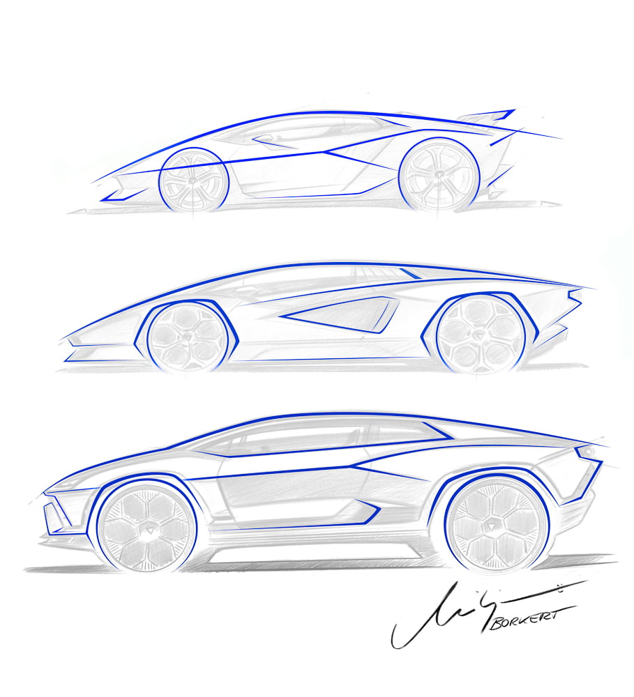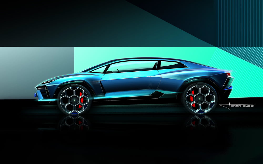 การออกแบบภายนอกให้ความรู้สึกบึกบึนห้าวหาญและเหนือล้ำทุกความคาดหมาย ด้วยเส้นสายที่เรียบง่ายและสะอาดตาซึ่งถือเป็นแบบฉบับของลัมโบร์กินีอย่างแท้จริง และยังเต็มไปด้วยความหนักแน่นซึ่งได้แรงบันดาลใจจากรถยนต์ลัมโบร์กินีรุ่นตำนานอย่าง Sesto Elemento, Murciélago และ Countach LPI 800-4 รูปลักษณ์ด้านข้างใช้เส้นสายที่เรียบง่ายในแบบฉบับลัมโบร์กินี ผสานกับโครงสร้างสถาปัตยกรรมเฉพาะตัวที่พัฒนาขึ้นสำหรับคอนเซ็ปต์คาร์โดยเฉพาะ โดยมีการออกแบบความลาดเอียงของห้องโดยสารอย่างชัดเจนจากทั้งด้านหน้าและด้านหลัง ในขณะเดียวกัน ดีไซน์ส่วนล่างของตัวรถยังได้รับการออกแบบตามหลักอากาศพลศาสตร์อันชาญฉลาด โดยผสานเข้ากับองค์ประกอบสุดล้ำที่ขยับได้ดังเช่นที่พบในรถซูเปอร์สปอร์ตของลัมโบร์กินีหลายรุ่น และด้วยความสูงสุดของหลังคาเพียง 1.5 เมตร ทำให้รถยนต์ Grand Turismo พลังไฟฟ้ารุ่นนี้โหลดต่ำเข้าใกล้พื้นถนนได้อย่างทรงพลัง มอบความประทับใจด้วยระดับการโหลดต่ำอย่างที่ไม่มีรุ่นใดเปรียบได้ ซึ่งเกิดจากรูปทรงที่พุ่งไปข้างหน้าของห้องโดยสารและเส้นสายไดนามิกที่คมชัดตลอดทั้งตัวรถ