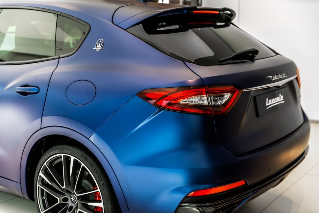 เส้นสายอันโดดเด่นของ Levante Trofeo Launch Edition ถูกเพิ่มความสปอร์ตยิ่งขึ้นด้วยตัวถังสีน้ำเงินด้าน Blu Emozione Matte ผสานชุดแต่ง Nerissimo Package ติดตั้งไฟหน้า Maxtrix LED กระจังหน้าทรงตั้งสีดำเปียโนแบล็ค พร้อมช่องดักลมแบบตาข่ายด้านล่าง ช่องดักอากาศด้านข้างบริเวณส่วนล่างของกระจังหน้า ปรับแต่งใหม่ให้มีรูปลักษณ์ดุดันขึ้นและมีลักษณะคล้ายปีก รีดอากาศให้กดลงบนล้อคู่หน้า เพิ่มสเถียรภาพช่วงความเร็วสูง ฝากระโปรงหน้าวัสดุคาร์บอนไฟเบอร์พร้อมช่องระบายอากาศ