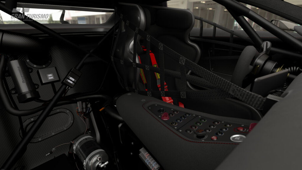 มีการลดน้ำหนักและจุดศูนย์ถ่วงโดยการถอดชิ้นส่วนที่ไม่จำเป็นในการตกแต่งภายในและแทนที่ด้วยวัสดุที่มีน้ำหนักเบา การออกแบบด้วยหลักการกระจายน้ำหนักหน้า-หลังแบบ 48:52 ได้ถูกนำมาใช้ แต่ละฟังก์ชั่นภายในห้องโดยสารถูกจัดเรียงโดยเน้นความสะดวกในการใช้งาน โดยเฉพาะอย่างยิ่งพวงมาลัย ที่ใช้การออกแบบพิเศษที่ช่วยเพิ่มประสิทธิภาพในการทำงาน นอกจากนี้ RX-VISION GT3 CONCEPT ยังให้ความสำคัญกับแง่มุมต่างๆ เช่นรูปทรงของเบาะนั่ง ตำแหน่งที่นั่ง การจัดวางคันเร่งและทัศนวิสัยในระหว่างการขับขี่