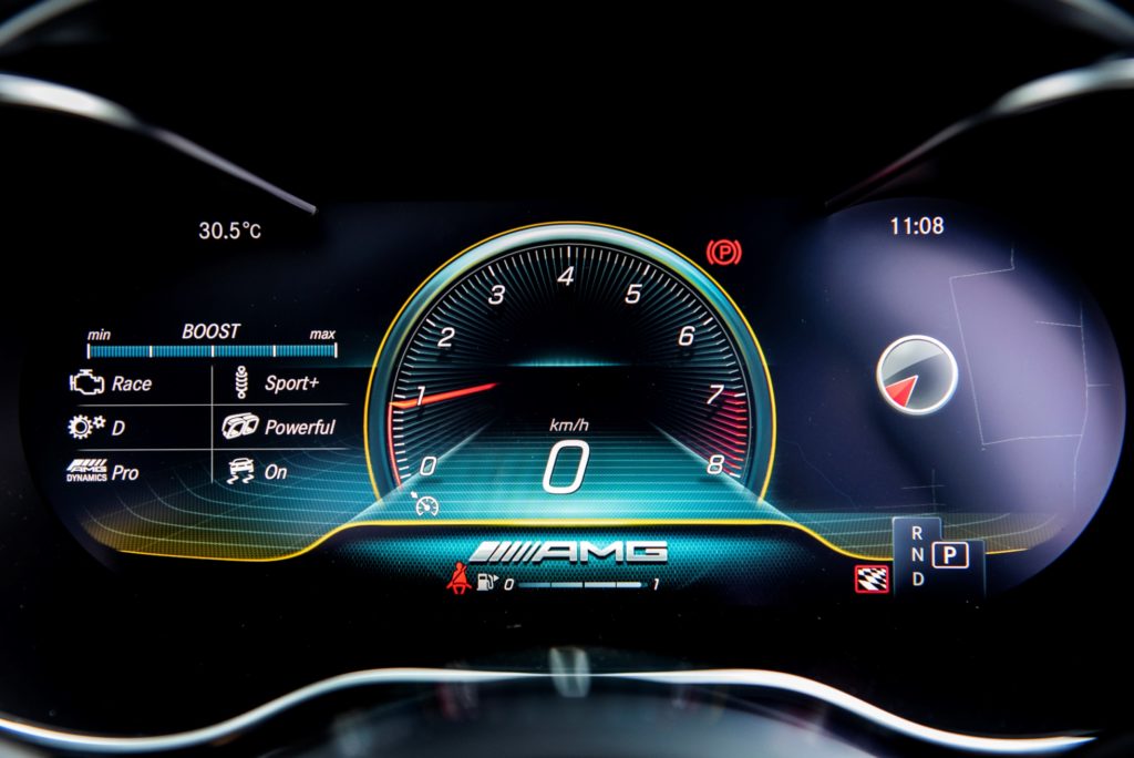 นอกจากนี้ Mercedes-AMG ยังติดตั้งหน้าจอดิจิทัลสำหรับแสดงความเร็ว และเกียร์ปัจจุบัน เมื่อเปิดการใช้งานโหมดเกียร์ธรรมดา โดยสัญลักษณ์ตัว M สีเหลืองจะปรากฏขึ้นมาที่หน้าจอ และรถยนต์รุ่นนี้ยังมาพร้อมกับระบบ AMG DYNAMIC SELECT ที่มีให้เลือก 5 โหมดขับขี่คือ Comfort, Sport, Sport+, Race และ Slippery ที่ช่วยกระจายกำลังให้เป็นไปอย่างสม่ำเสมอ และเหมาะสมกับสภาพถนนที่เปียกเพราะฝนหรือหิมะ