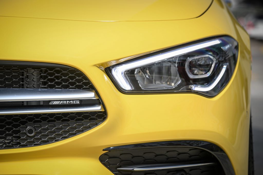 CLA 35 4MATIC ถ่ายทอดจิตวิญญาณจากสนามแข่งสู่ดีไซน์สปอร์ตทั้งภายนอกและภายในได้อย่างลงตัว เริ่มจากดีไซน์ภายนอกของกระจังหน้า AMG-specific radiator grille สอดรับกับไฟหน้า LED High Performance headlamps ที่ให้รูปลักษณ์การส่องสว่างที่สวยงามและทัศนวิสัยการขับขี่ยามค่ำคืนที่สมบูรณ์ทว่าใช้พลังงานต่ำ เสริมความหล่อด้วยกันชนหน้า-หลัง AMG BodyStyling สปอยเลอร์หลัง AMG Spoiler Lip ติดตั้งล้ออัลลอย AMG แบบ 5 ก้านคู่ ขนาด 19 นิ้ว พร้อมยางขนาด 245/35 R19 คาลิปเปอร์เบรกตกแต่งด้วยสีเทาพร้อมสัญลักษณ์ AMG ปิดท้ายด้วยท่อไอเสียแบบ AMG exhaust system ให้เสียงคำรามเร้าใจต่างกันตามโหมดการขับขี่