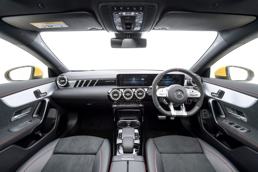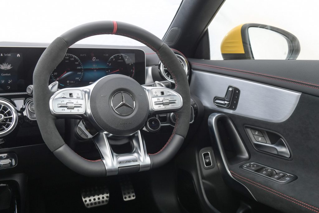 ดีไซน์ภายในของ CLA 35 4MATIC เน้นความสปอร์ตสไตล์รถแข่งในทุกรายละเอียด เริ่มตั้งแต่เบาะนั่ง AMG Sport seat หุ้มหนัง ARTICO สลับ DINAMICA microfibre สีดำที่ให้ความรู้สึกราวกับเป็นนักแข่ง เบาะปรับไฟฟ้าพร้อมฟังก์ชั่นจดจำตำแหน่ง ต่อเนื่องไปถึงพวงมาลัยแบบ AMG Performance หุ้มหนัง Nappa และ DINAMICA microfibre ที่มาพร้อมกับ AMG steering wheel buttons ตามแบบฉบับสไตล์นักแข่ง Formula 1 สามารถเปลี่ยนโหมดการขับขี่ได้อย่างรวดเร็วเพียงปลายนิ้วสัมผัส
