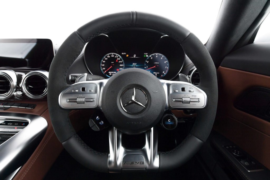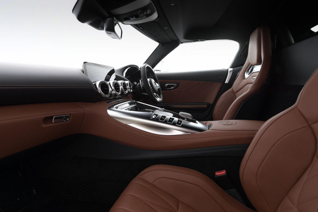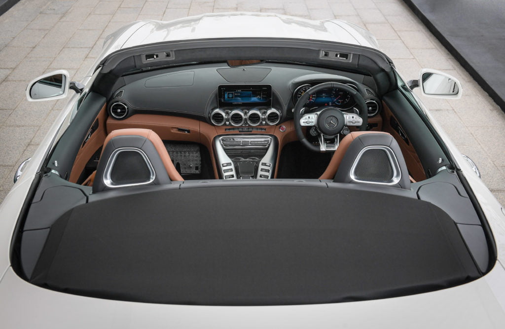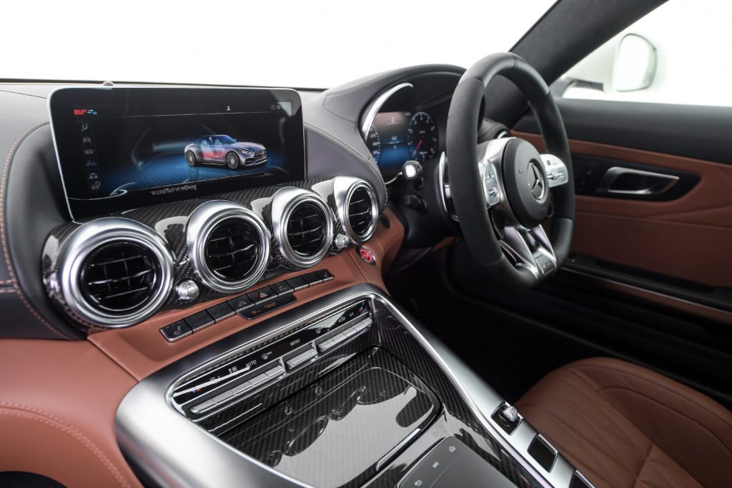 ภายในห้องโดยสารของ GT C Roadster มาพร้อมกับเบาะนั่งทรงสปอร์ตหุ้มหนัง Nappa ที่อยู่ต่ำเพื่อช่วยโอบล้อมผู้ขับขี่ให้รู้สึกราวกับอยู่ในรถแข่ง พวงมาลัย AMG Performance หุ้มหนัง Nappa และเส้นใย DINAMICA Microfibre พร้อมจอแสดงผลบนพวงมาลัย 2 จอ แบบ AMG steering wheel buttons ลงตัวด้วยหน้าจอเรือนไมล์แบบ all-digital instrument display ขนาด 12.3 นิ้ว หรือสามารถสร้างความโดดเด่นให้มากยิ่งขึ้นด้วยชุดเบาะเสริมแบบ AMG Performance ที่สามารถปกป้องร่างกายของผู้ขับขี่และผู้โดยสารทั้งด้านหน้าและด้านหลังได้มากขึ้นด้วยพนักพิงหลังที่มีความโค้งและเสริมด้วยวัสดุเพื่อความนุ่มสบายที่ด้านข้างมากกว่าเบาะที่นั่งแบบมาตรฐาน