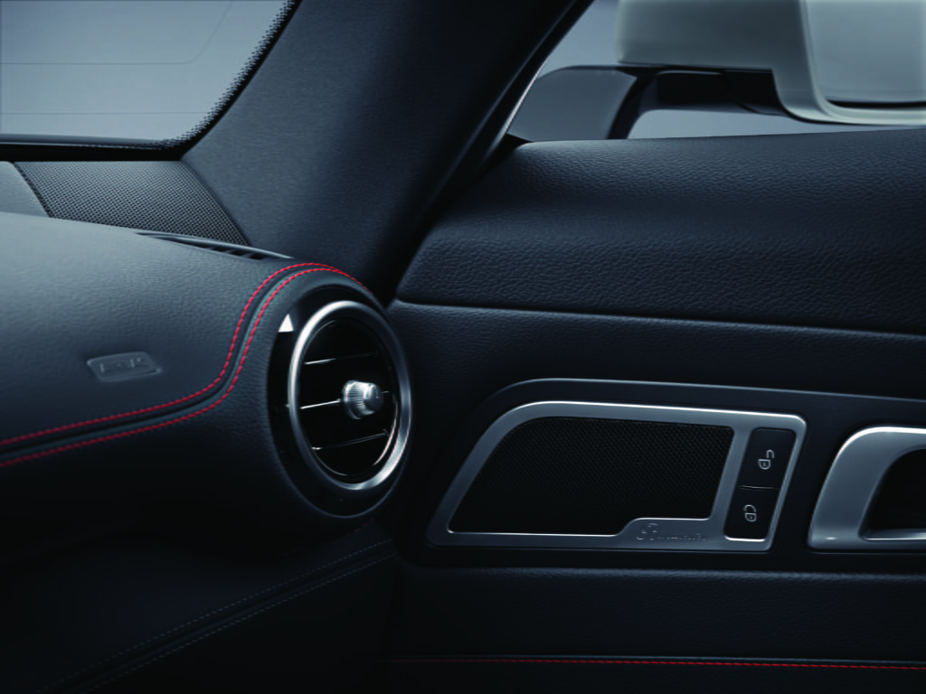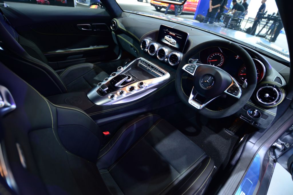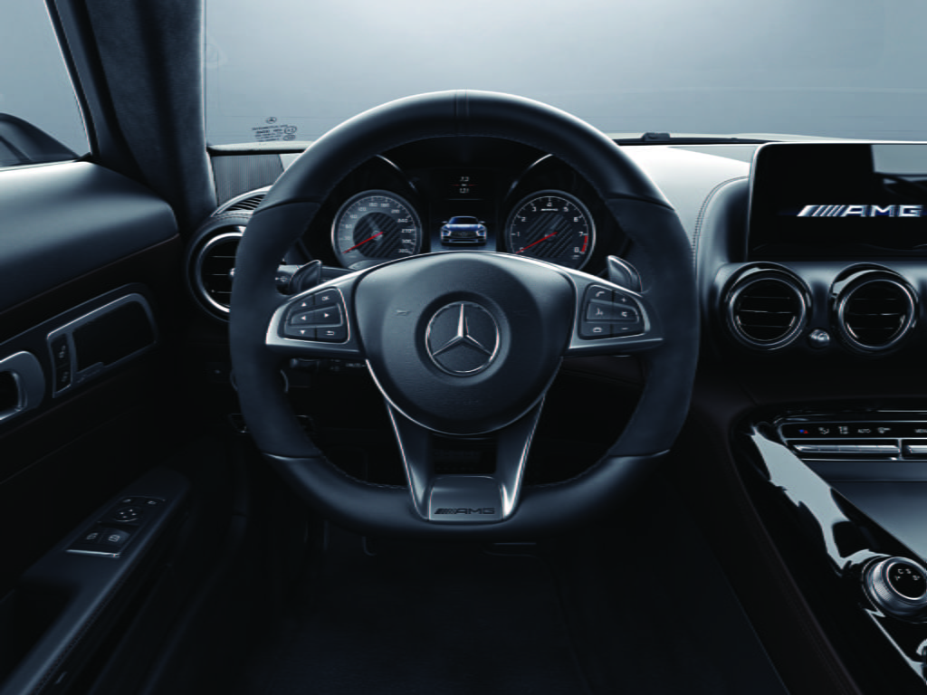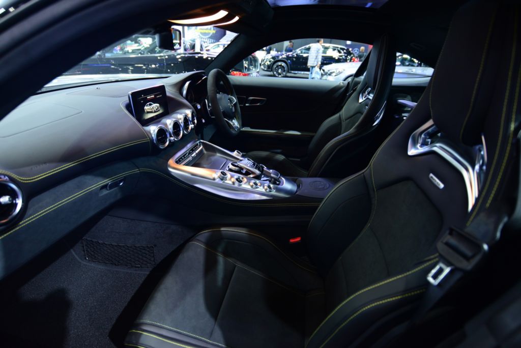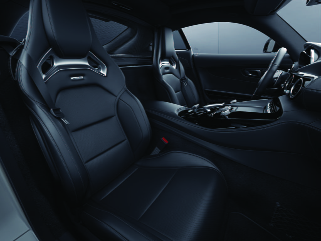 ภายในมาพร้อมเบาะหนัง Nappa ที่อยู่ต่ำเพื่อช่วยโอบล้อมผู้ขับขี่ให้รู้สึกราวกับอยู่ในรถแข่ง, พวงมาลัย AMG Performance Steering wheel หรือสามารถสร้างความโดดเด่นให้มากยิ่งขึ้นด้วยชุดเบาะแบบเอเอ็มจีที่สามารถปกป้องร่างกายของผู้ขับขี่และผู้โดยสารทั้งด้านหน้าและด้านหลังได้มากขึ้นด้วยพนักพิงหลังที่มีความโค้งและเสริมด้วยวัสดุเพื่อความนุ่มสบายที่ด้านข้างมากกว่าเบาะที่นั่งแบบมาตรฐาน เพิ่มความสปอร์ตแต่หรูหรา ด้วยวัสดุโครเมียมสีเงินบนคอนโซลกลาง ช่องแอร์ และที่พักแขน แผงหน้าปัดกว้าง ทำให้ทั้งผู้ขับขี่และผู้โดยสารรู้สึกราวกับถูกโอบล้อมด้วยปีกนก