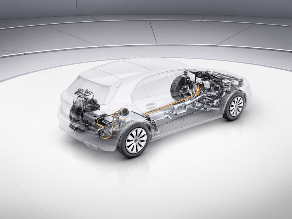 ระบบไอเสียที่ได้รับการออกแบบใหม่ซ่อนอยู่ใต้ท้องรถที่ด้านหลัง มีตัวควบคุมเสียงและกรองไอเสียอยู่ในหม้อพัก มีการเขยิบถังน้ำมันถอยมาอยู่ที่ระหว่างเพลาหลังทำให้มีพื้นที่สำหรับวางแบตเตอรี่ใต้เบาะหลัง ผลที่ได้คือพื้นที่ห้องเก็บสัมภาระลดลงจาก A-Class รุ่นปกติเพียงเล็กน้อยเท่านั้น