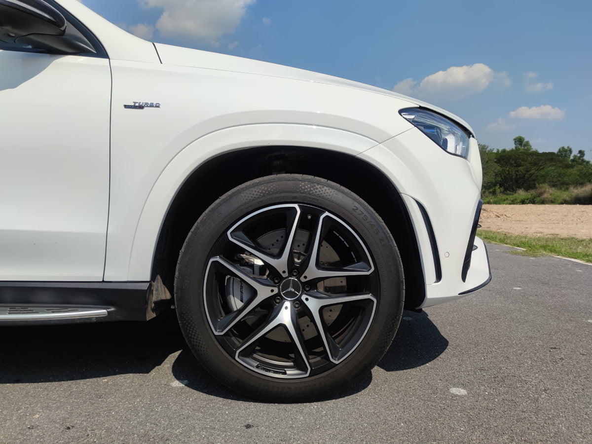 ล้อแม็กเป็นลาย 5 แฉก และมีลายโครเมียมสลับกับสีดำด้านให้ความสปอร์ต และมีคาลิปเปอร์เบรกที่มีโลโก้ของ AMG ส่วนเบรกจะเป้นจากเบรกขนาดใหญ่และมีรุระบายความร้อนร่วมด้วย โดยซีรี่ส์ยางล้อหลังจะไม่เท่ากับด้าหน้า ซึ่งด้านหน้าเป็น 45 ส่วนด้านหลังเป็น 40 R 21 ดิสก์เบรกจะเหมือนกับด้านหน้าแต่จะไม่มีรูระบายอากาศ