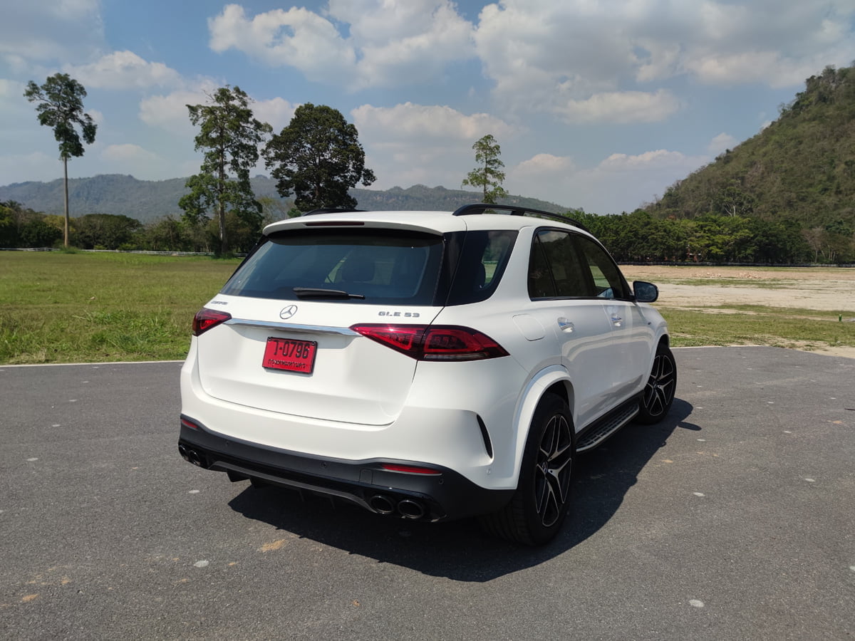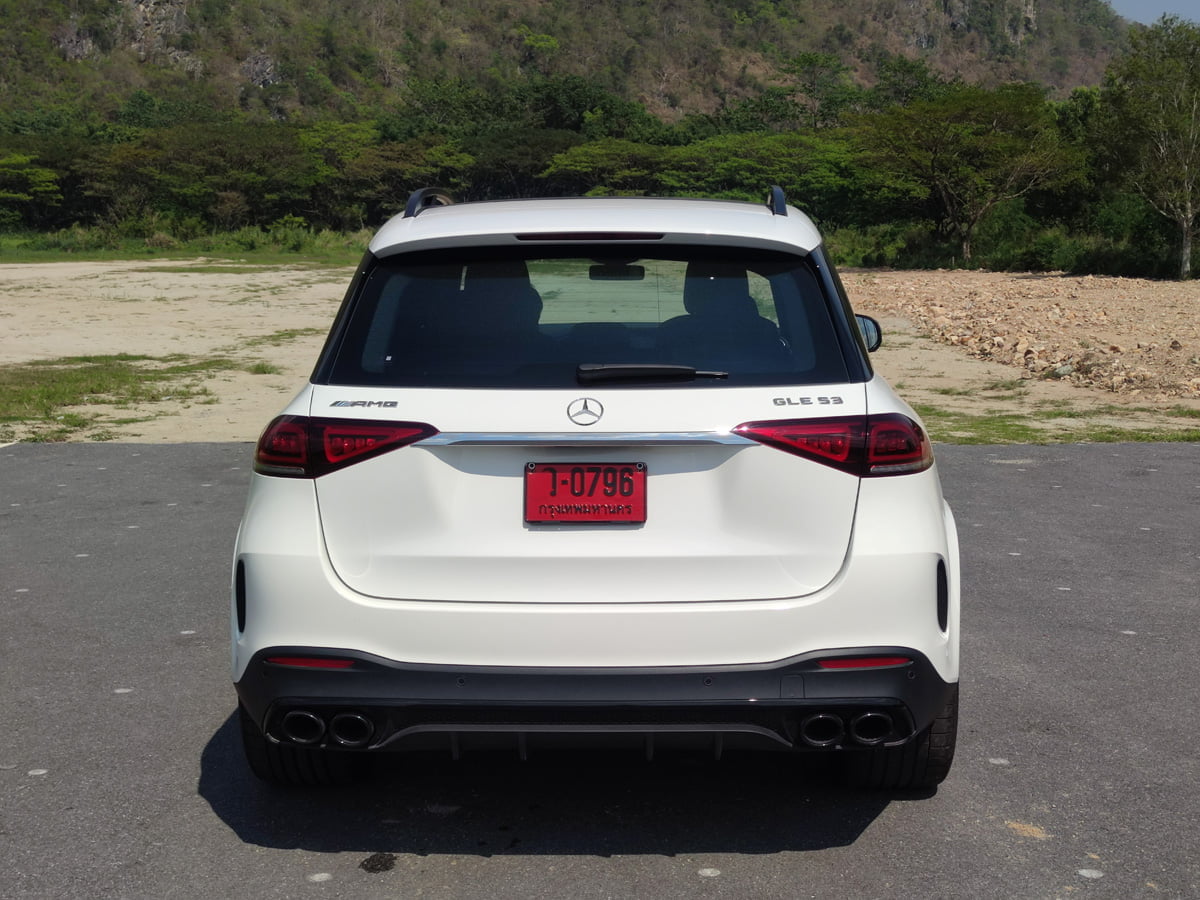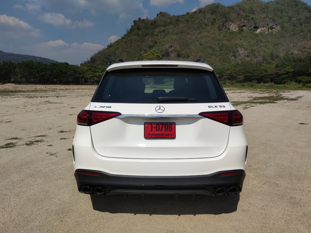 ท้ายรถมีสปอร์ยเลอร์พร้อมไฟเบรกดวงที่ 3 ตามาด้วยรหัส GLE 53 และที่ขาดไม่ได้เลยคือเครื่องหมาย AMG ซึ่งแสดงว่ารุ่นนี้เป็น GLE AMG รุ่นที่มีสมรรถนะสูงไม่ใช่ GLE ธรรมดา ส่วนไฟเบรกจะเป็นรุ่นใหม่คือ Block LED ลงมาที่ด้านล่างของรถจะมี diffuser ที่จะช่วยในเรื่องของ Aero Dynamic และยังมีท่อคู่รมดำแนวสปอร์ต มีสัญลักษณ์ AMG สำหรับท่อคู่นี้เมื่อเราปรับเป็นโหมดสปอร์ตเสียงจะคำรามเพื่อบอกว่าเป็นรถ SUV ที่มีสมรรถนะสูง