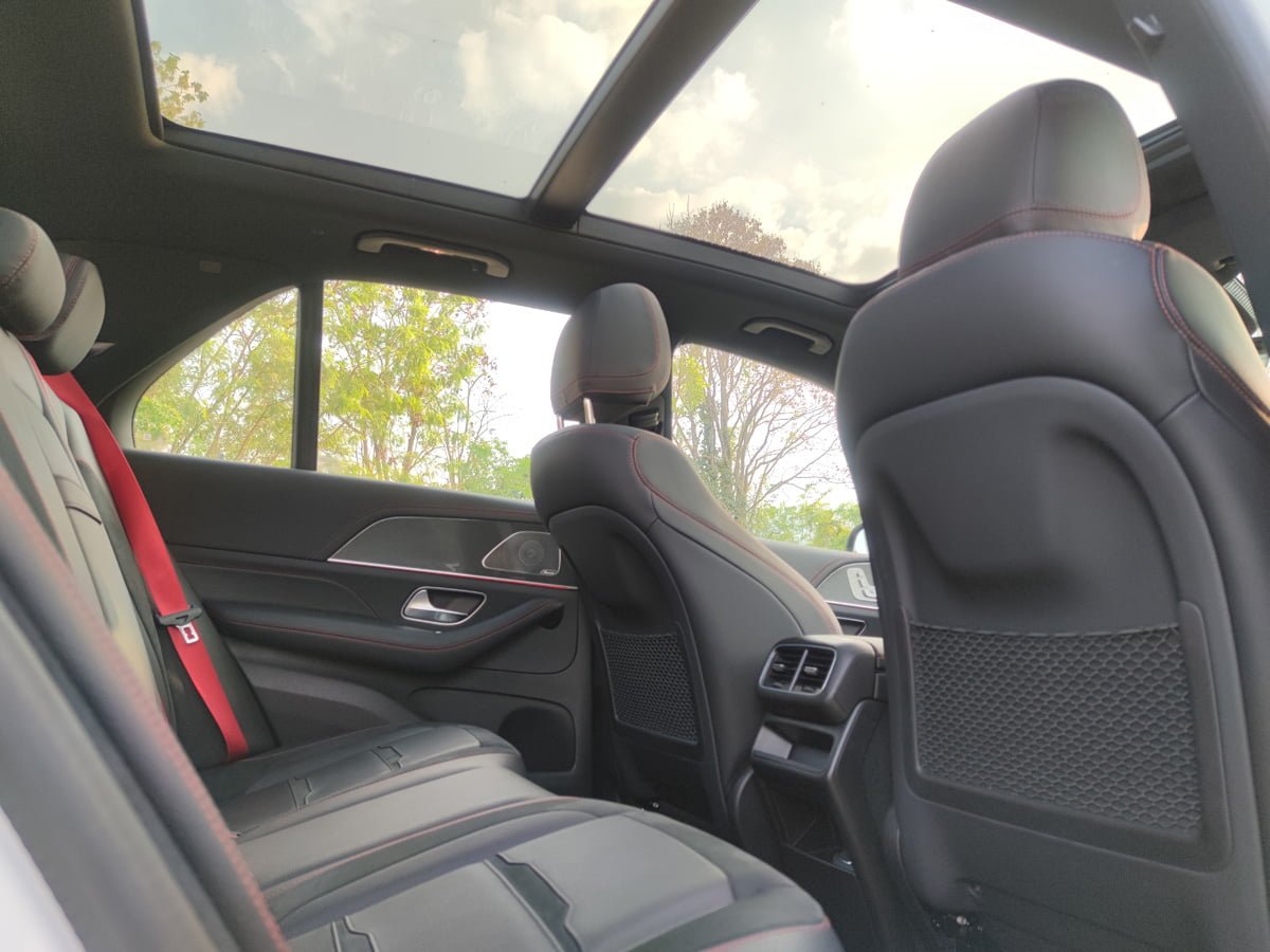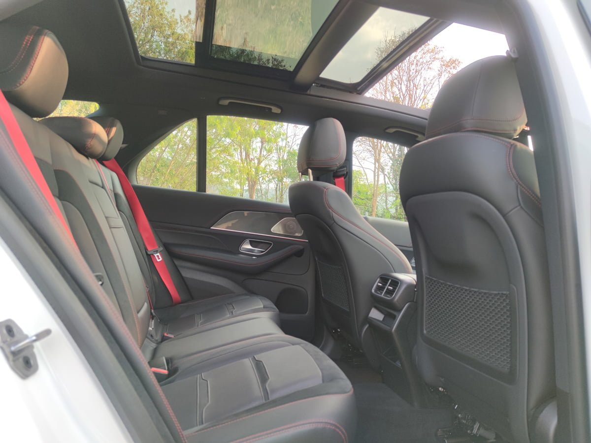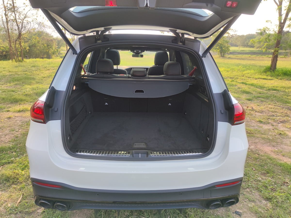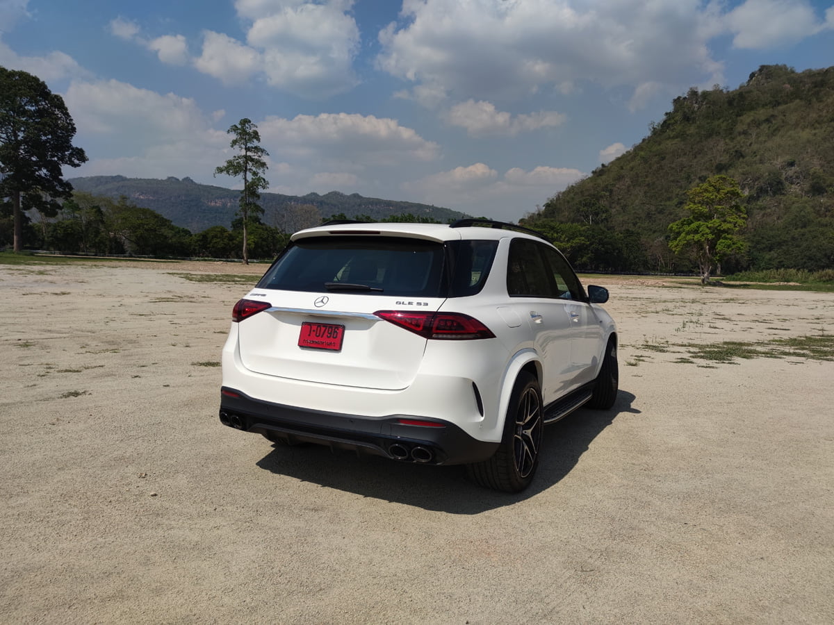 ท้ายรถมีสปอร์ยเลอร์พร้อมไฟเบรกดวงที่ 3 ตามาด้วยรหัส GLE 53 และที่ขาดไม่ได้เลยคือเครื่องหมาย AMG ซึ่งแสดงว่ารุ่นนี้เป็น GLE AMG รุ่นที่มีสมรรถนะสูงไม่ใช่ GLE ธรรมดา ส่วนไฟเบรกจะเป็นรุ่นใหม่คือ Block LED ลงมาที่ด้านล่างของรถจะมี diffuser ที่จะช่วยในเรื่องของ Aero Dynamic และยังมีท่อคู่รมดำแนวสปอร์ต มีสัญลักษณ์ AMG สำหรับท่อคู่นี้เมื่อเราปรับเป็นโหมดสปอร์ตเสียงจะคำรามเพื่อบอกว่าเป็นรถ SUV ที่มีสมรรถนะสูง