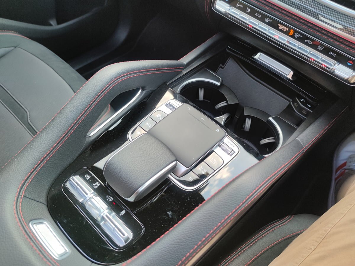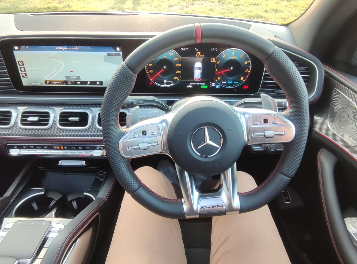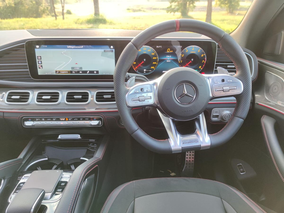 ถัดมาเป็นพวงมาลัยทรงสปอร์ตสไตล์เอเอ็มจีซึ่งตัวนี้จะเป็นหนัง Nappa และมี Mark Center สีแดงโดยมีท้ายพวงมาลัยเป็นท้ายตัดที่มีสัญลักษณ์ AMG อยู่ชัดเจนซึ่งส่วนนี้จะเป็นสีโครเมียมตัดสลับกับพวงมาลัยสีดำที่มีโลโก้เบนซ์ดูสวยทีเดียว และมี Paddle Shift มาให้ ซึ่งฝั่งซ้ายของพวงมาลัยจะเป็นเกี่ยวกับการบังคับควบคุมระบบ Infotainment ส่วนด้านขวาจะเป็นเรื่องของระบบการขับขี่หรือระบบความปลอดภัย นอกจากนี้ยังมีหน้าจอมาตรวัดขนาดใหญ่สอง 12.3 นิ้ว ที่แสดงเป็นภาพโดยเราสามารถปรับได้ตามอารมณ์การขับขี่และจะแสดงเรื่องของระบบการขับขี่ต่าง ๆ ด้วย ถัดมาจะเป็นเรื่องของระบบ Infotainment ที่มีขนาดจอเท่ากันคือ 12.3 นิ้ว ในจอนี้จะมีเรื่องของระบบเนวิเกเตอร์นำทางด้วยซึ่ง Maps นำทางตัวนี้เป็นการบันทึกลงในฮาร์ดดิสก์ก็จะมีการอัพเดทอยู่ตลอดเวลา ซึ่งเราขับคันนี้มาจากกรุงเทพโดยใช้แผนที่ในจอซึ่งก็ให้รายละเอียดทางที่ชัดเจน