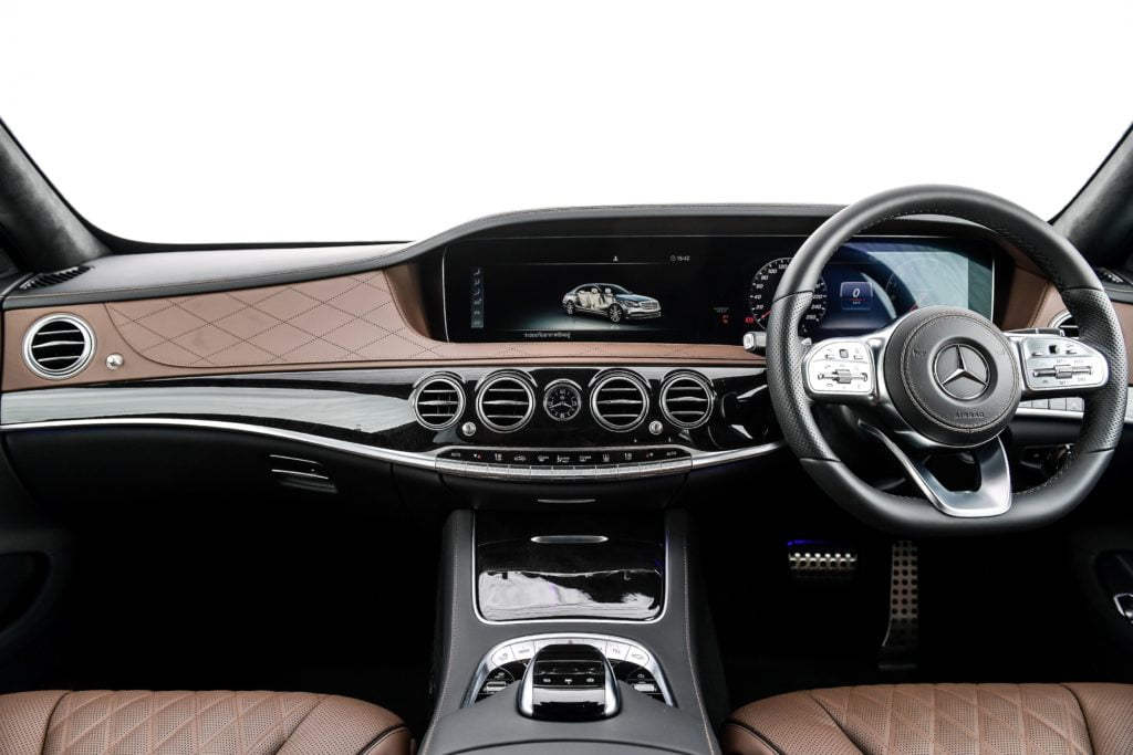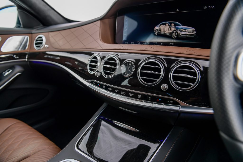 การตกแต่งภายในหรูหราขั้นสุดตามแบบฉบับ S- Class ด้านบนของแดชบอร์ดหน้าและที่วางตรงคอนโซลกลางหุ่มด้วยหนัง Nappa ผ้าหลังคาและแผงบังแดดหน้าหุ้มด้วย DINAMICA microfibre รวมถึงลายไม้ที่แผงประตูทั้ง 4 บาน