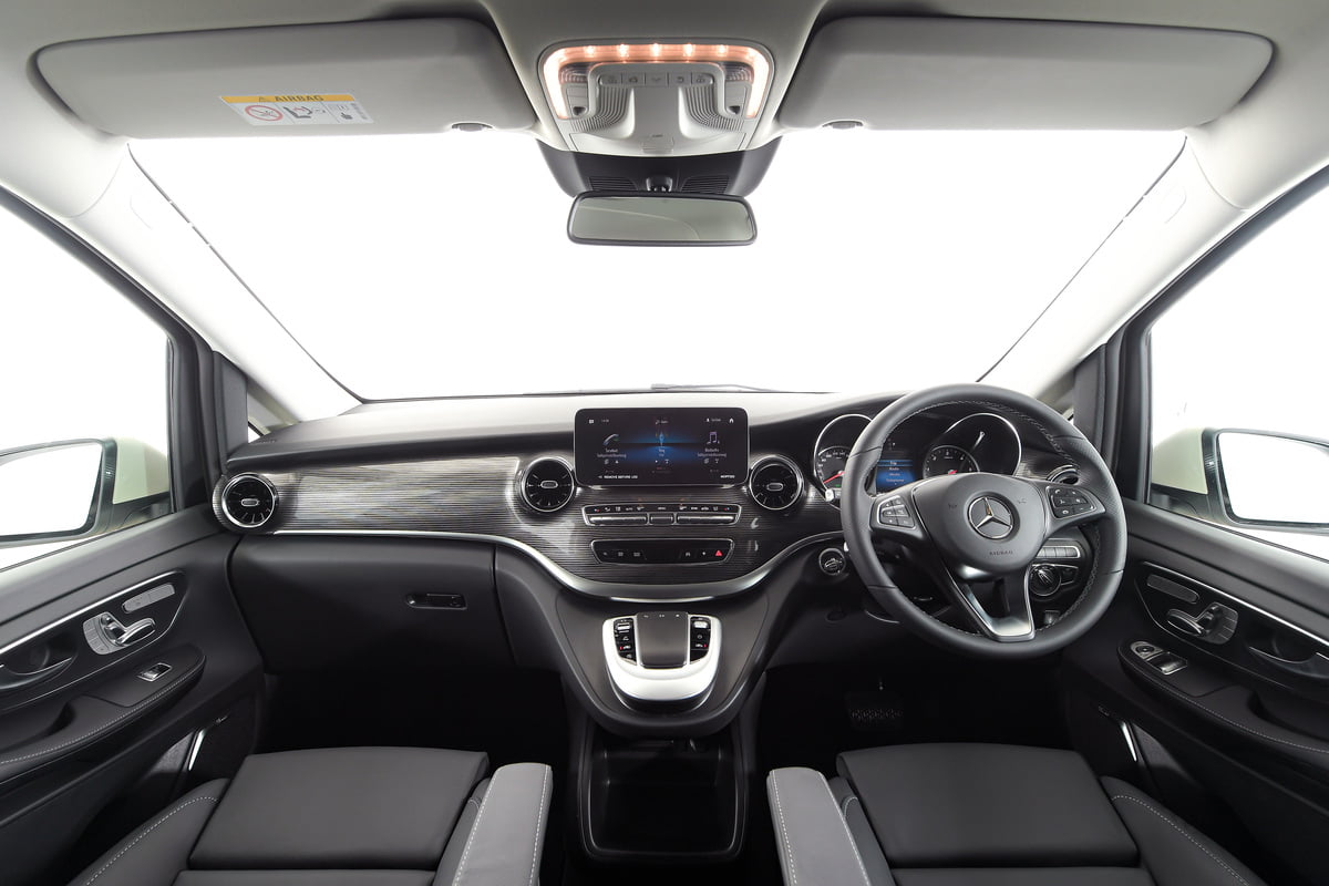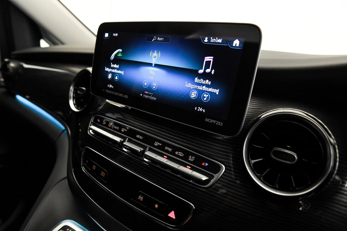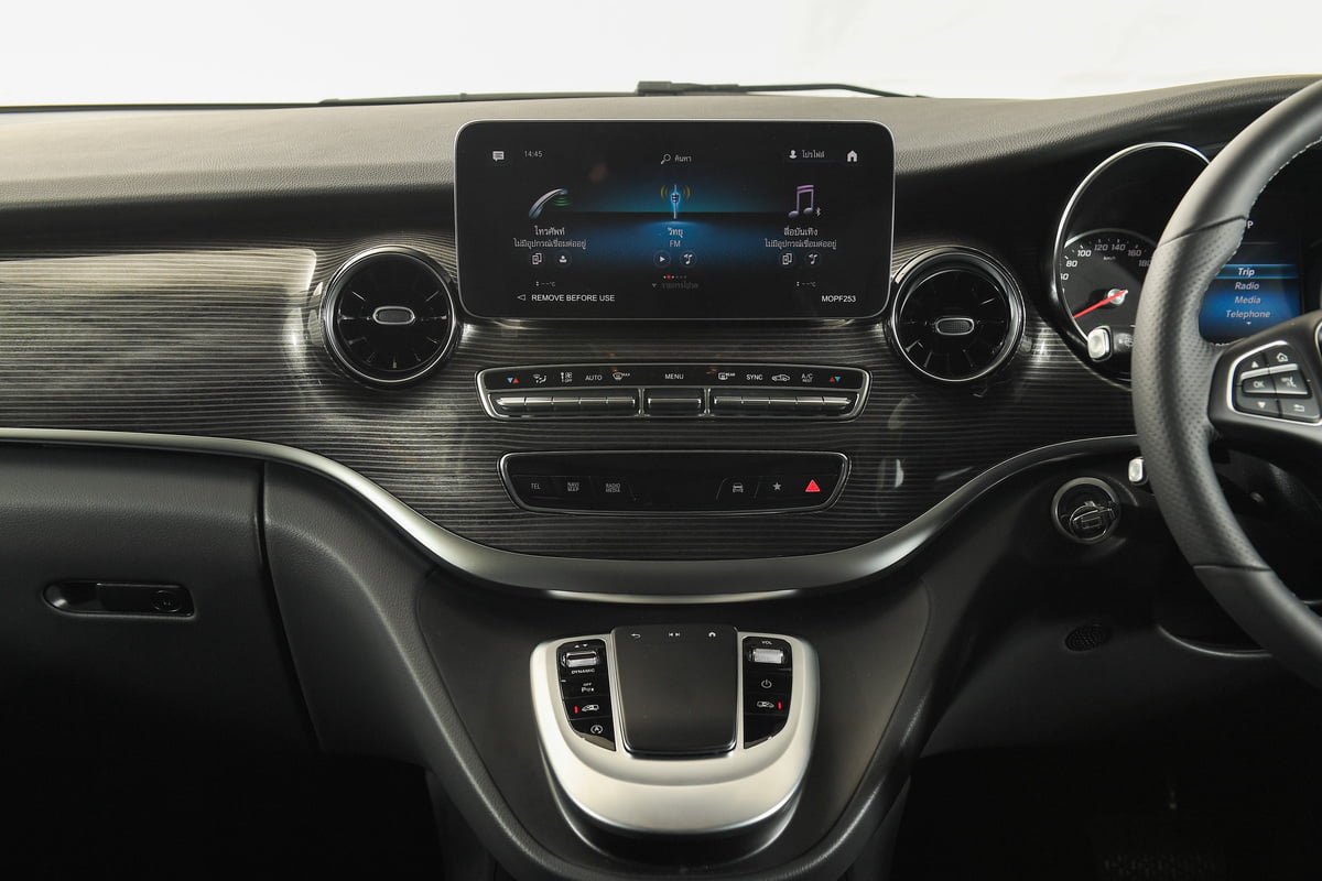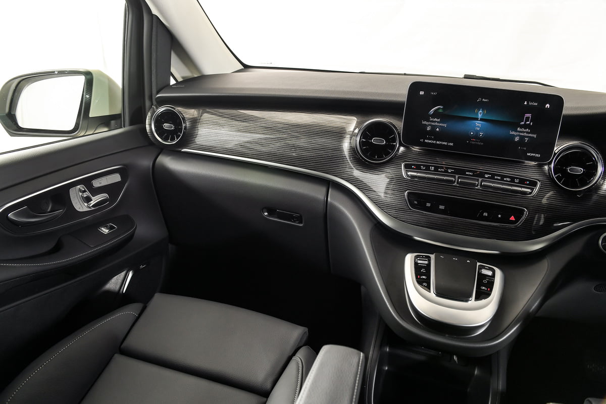 Mercedes-Benz V 250 d Exclusive ถูกออกแบบอย่างประณีตและพิถีพิถันตามแบบฉบับของเมอร์เซเดส-เบนซ์ โดยมีสไตล์ที่เรียบหรู แฝงไปด้วยความสปอร์ตอย่างมีระดับ มีการติดตั้งฟังก์ชั่นการใช้งานที่มอบความสะดวกสบายให้ทั้งผู้ขับขี่และผู้โดยสารได้เป็นอย่างดี ภายในติดตั้งพวงมาลัยมัลติฟังก์ชั่นที่สามารถควบคุมการใช้งานต่างๆ ภายในรถได้อย่างอัจฉริยะ พร้อมเสริมความสนุกในการขับขี่ด้วยแป้นควบคุมการเปลี่ยนเกียร์ (DIRECT SELECT gearshift paddles) สำหรับการตกแต่งภายในมีการหุ้มเบาะด้วยหนัง Lugano สีดำ ตกแต่งคอนโซลด้วยลวดลาย pinstripe effect ที่มีความลงตัวรับกับหน้าจอหลักบนคอนโซลกลางที่เป็นจอมัลติมีเดียขนาด 10.25 นิ้ว ใช้ระบบเชื่อมต่อแบบ Smart Phone Integration รองรับ Apple CarPlay และ Android Auto รวมถึงระบบ MBUX (Mercedes-Benz User Experience) ที่ผสานการทำงานของระบบมัลติมีเดียเข้ากับเทคโนโลยีอัจฉริยะ AI เพื่อเรียนรู้และจดจำพฤติกรรมของผู้ขับขี่ และควบคุมระบบความบันเทิงผ่านคำสั่งเสียง พร้อมยกระดับบรรยากาศที่ดีเยี่ยมในห้องโดยสารด้วยคุณภาพของระบบเสียงรอบทิศทางแบบ Burmester และแสงไฟ Ambient Light แบบปรับเฉดสีได้ 3 สี
