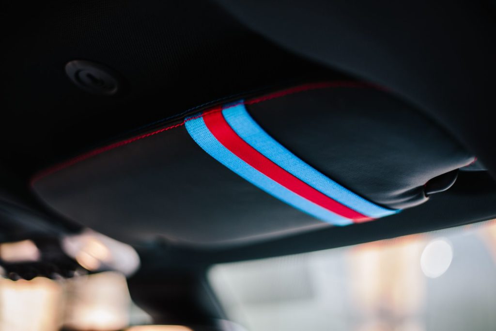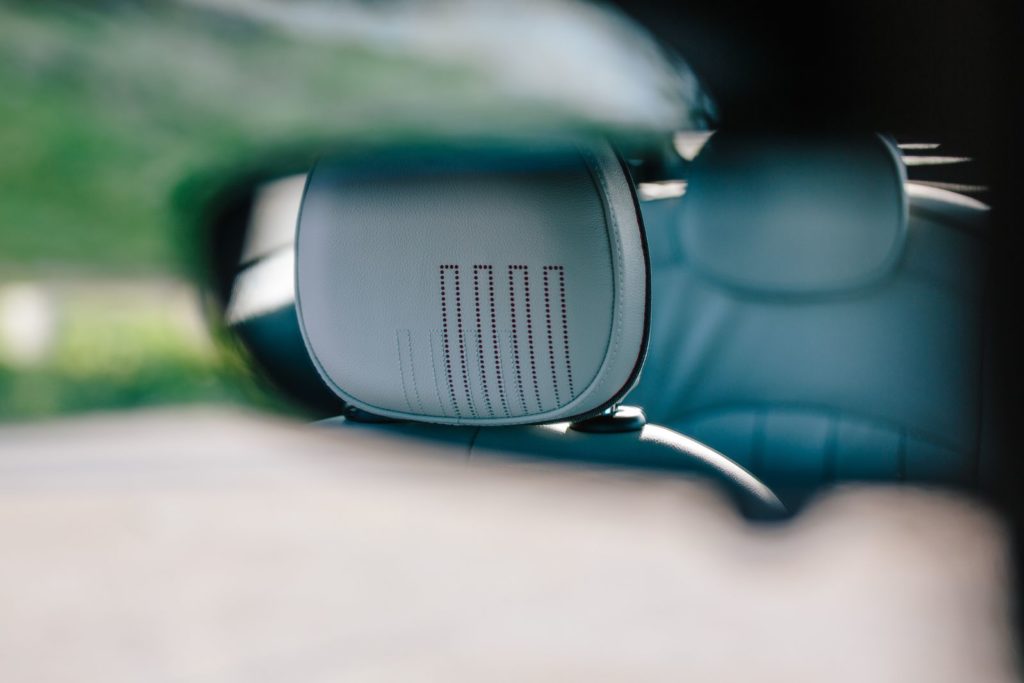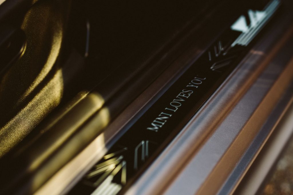 เบาะหนังแท้สีเทา Satellite Grey ช่วยเสริมความเอ็กซ์คลูซีฟของ Mini Hatch รุ่นพิเศษ ขอบโครเมียมภายในรถมาในสีเคลือบเงาฟ้าอมดำเช่นเดียวกับภายนอก แผงคอนโซลหน้าฝั่งผู้โดยสาร เป็นอีกชิ้นส่วนจากเครื่องพิมพ์สามมิติ ที่พิมพ์ลวดลายชื่อของบ่าวสาว วันที่ของพิธีเสกสมรส และคำอวยพรแก่คู่บ่าวสาว เส้นสายภายในรถบริเวณประตู หลังพวงมาลัย และพนักพิงศีรษะ ยังได้รับการออกแบบให้เข้ากันเป็นอย่างดีกับลวดลายกราฟฟิคบนหลังคารถ โดยบริเวณพนักพิงศีรษะทั้งสองด้าน ฉลุลวดลายที่ได้รับแรงบันดาลใจจากธงยูเนียนแจ็คและธงสหรัฐ