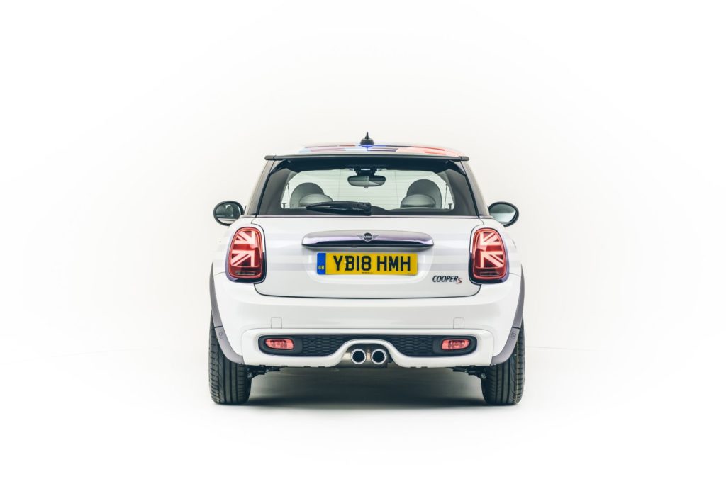 Mini Hatch รุ่นพิเศษมาในสีขาว Crystal White พร้อมแถบสีเงินอมฟ้าตามแนวตัวถังรถ รับกับขอบโครเมียมสีเงินอมฟ้าแบบด้านรอบคันอย่างลงตัว สร้างความสะดุดตาที่ไม่เหมือนใครด้วยฟีเจอร์ต่างๆ อันเป็นเอกลักษณ์ของมินิ เช่น กระจังหน้าทรงหกเหลี่ยม มือจับประตู วงแหวนโครเมียมรอบไฟหน้าและไฟท้าย ที่มาในสีเคลือบเงาฟ้าอมดำ ไฟท้ายและล้ออัลลอยโดดเด่นสะกดทุกสายตาด้วยดีไซน์ลายธงยูเนียนแจ็ค หรือธงชาติสหราชอาณาจักร หนึ่งในไฮไลท์ของดีไซน์ใหม่ล่าสุดจากมินิ พร้อมเสริมความทันสมัยและความเฉพาะตัวให้แก่ตัวรถด้วยขอบล้อสีน้ำเงินเข้มเมทาลิคแบบด้าน