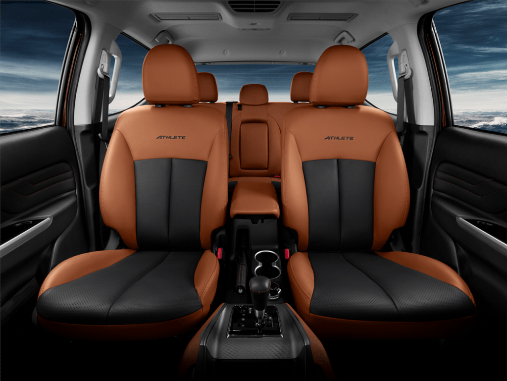 ภายในห้องโดยสารของ Triton Athlete ใหม่ ตกแต่งพิเศษด้วยเบาะหุ้มหนังสังเคราะห์ทูโทนสีดำสลับส้มพร้อมสัญลักษณ์ ‘ATHLETE’ เดินด้ายสีส้มที่หัวเกียร์ แผงประตู และเบรกมือ วัสดุบุนุ่มกันกระแทกบริเวณหัวเข่า และฝากล่องเก็บของคอนโซลกลางตกแต่งด้วยสีส้ม พร้อมพรมห้องโดยสารปักสัญลักษณ์ ‘ATHLETE’ สีส้ม