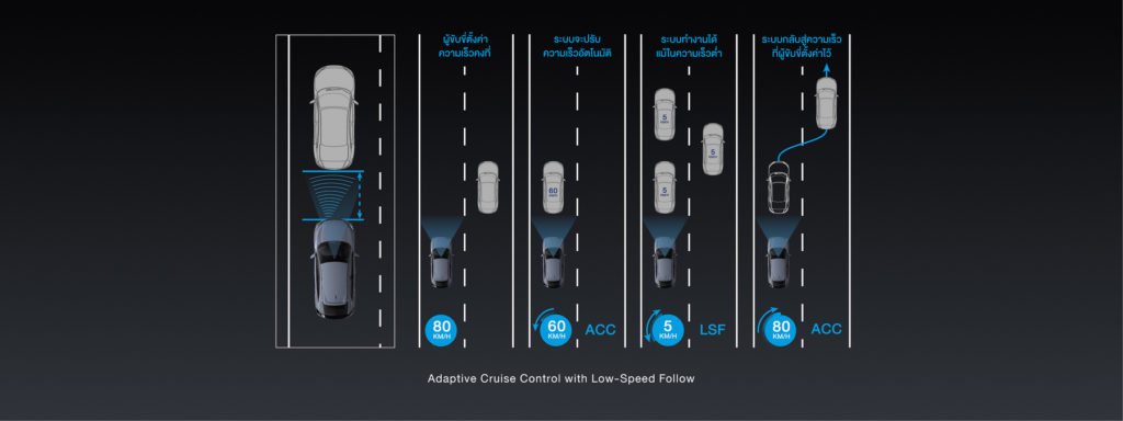- ระบบควบคุมความเร็วอัตโนมัติแบบแปรผันพร้อมระบบปรับความเร็วตามรถยนต์คันหน้าที่ความเร็วต่ำ (Adaptive Cruise Control with Low-Speed Follow: ACC with LSF)