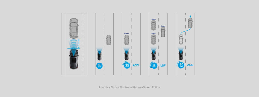 - ระบบควบคุมความเร็วอัตโนมัติแบบแปรผันพร้อมระบบปรับความเร็วตามรถยนต์คันหน้าที่ความเร็วต่ำ (Adaptive Cruise Control with Low-Speed Follow: ACC with LSF)