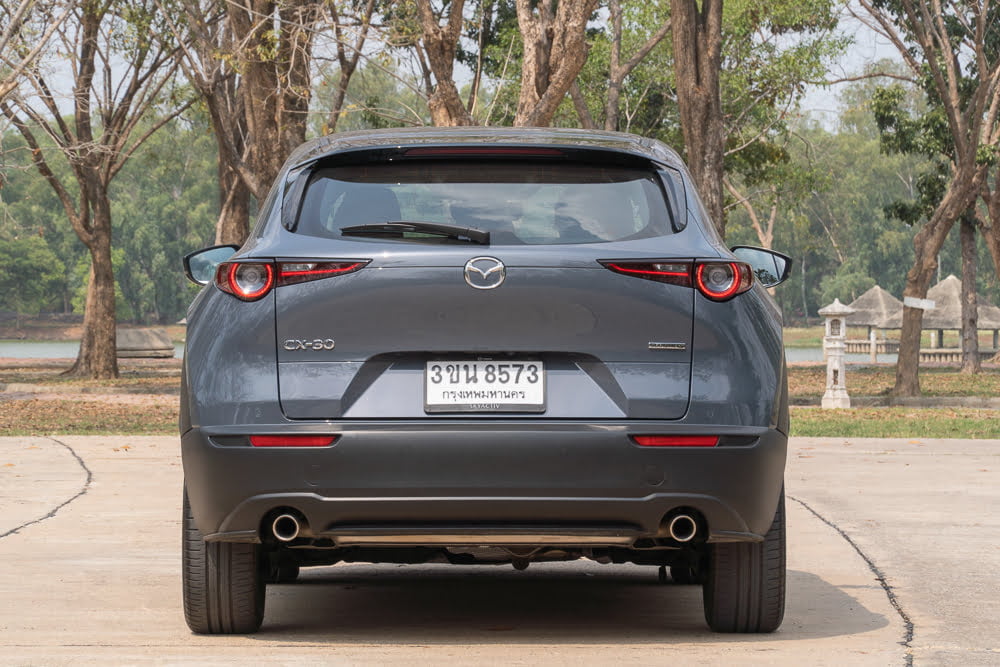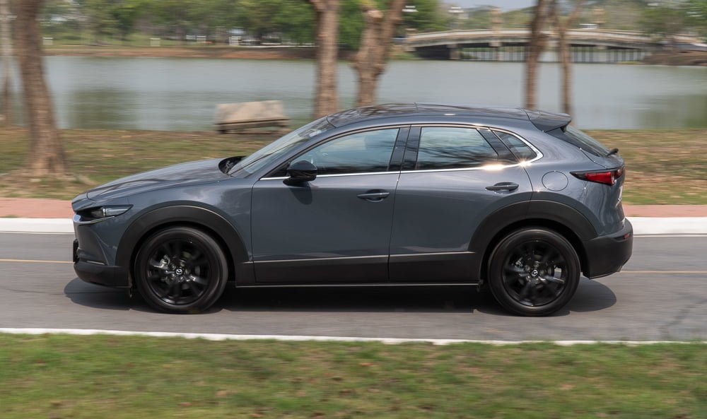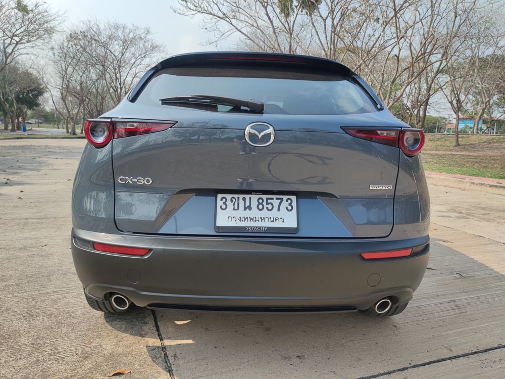 เราจะเห็นว่าเสาหน้าเอนลาดด้วยองศาที่สมบูรณ์แบบและลงตัว สำหรับมิติตัวถังของ CX-30 มีความยาว 4,395 มิลลิเมตร กว้าง 1,795 มิลลิเมตร สูง 1,540 มิลลิเมตร ความยาวฐานล้อ 2,655 มิลลิเมตร ระยะห่างล้อหน้า 1,565 มิลลิเมตร ระยะห่างล้อหลัง 1,565 มิลลเมตร