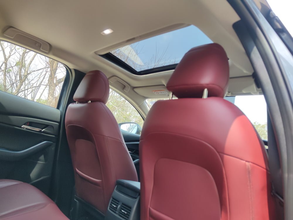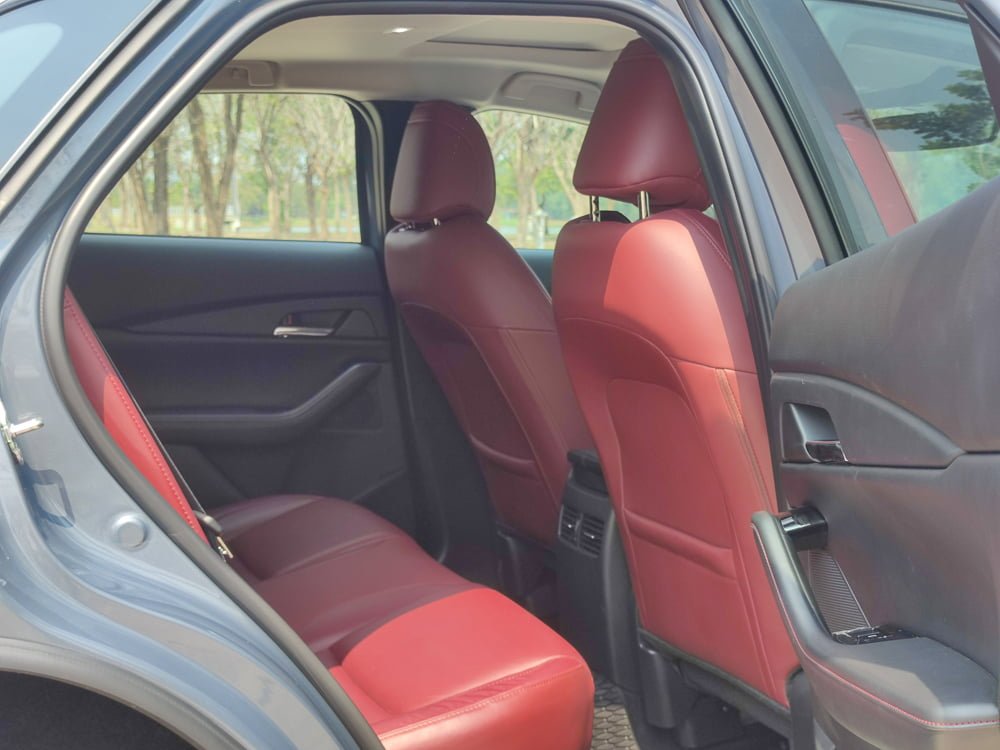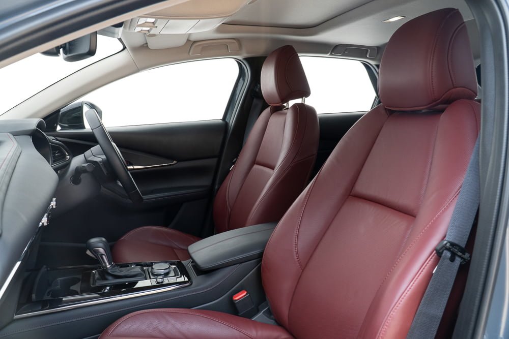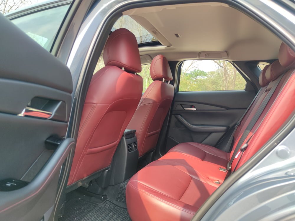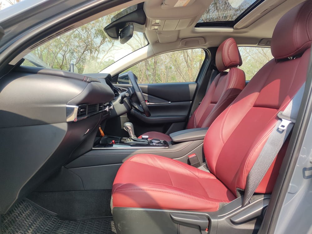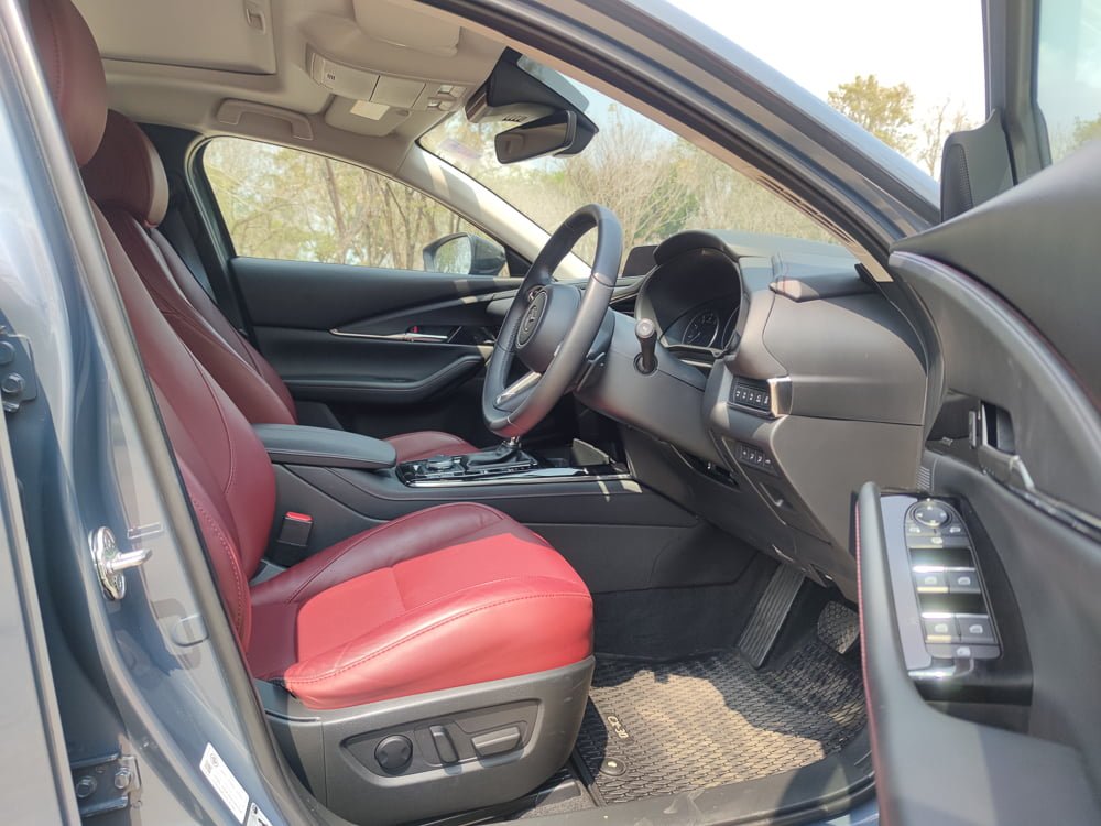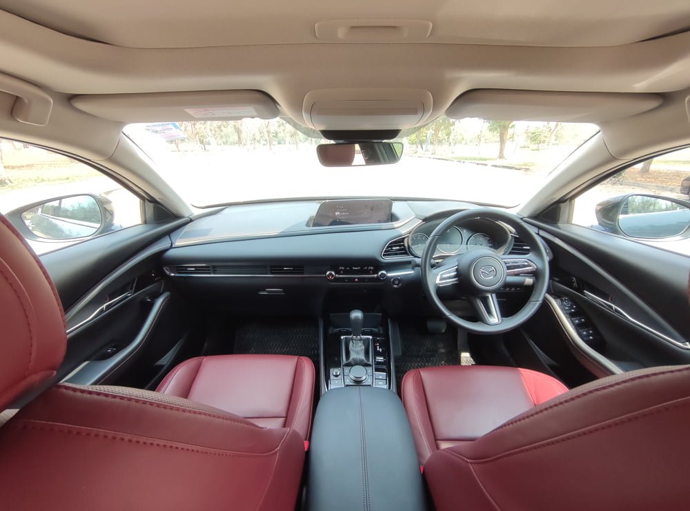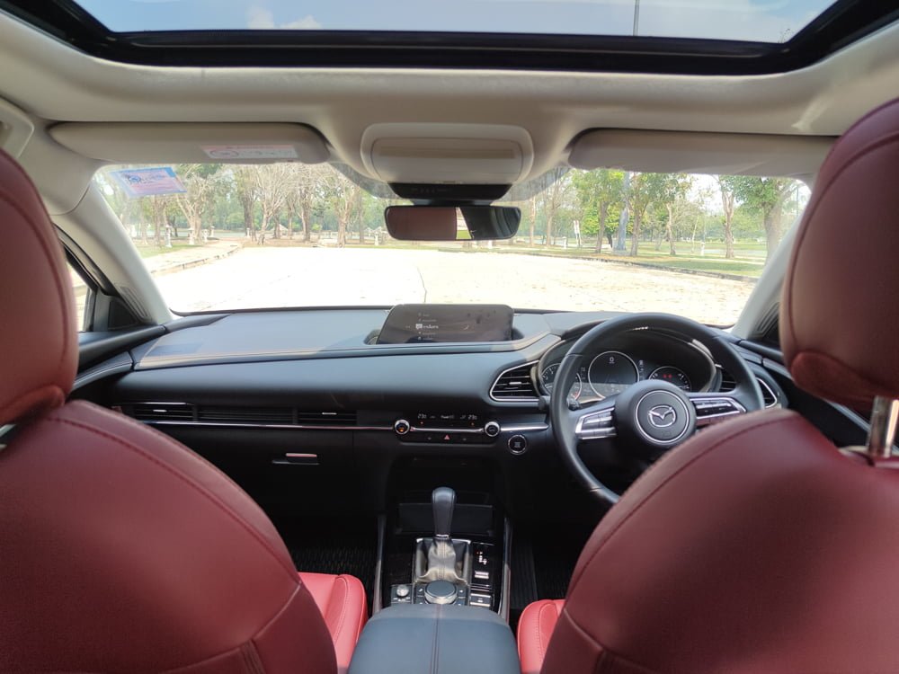 ภายในของ Mazda CX30 เรียกได้ว่า ยก มาสด้า 3 มาเกือบจะทั้งหมดก็ว่าได้แต่ให้ความรู้สึกโปร่งสบายกว่า และก็มีความแตกต่างกันในบางจุด หลักๆ โทนสีคาร์บอนเข้มดูหรูหราและดูสุขุมมากกว่าในรุ่นปกติที่เป็นสีน้ำตาล ในส่วนของเบาะจะหุ้มหนังสีแดงดบอร์กันดีเสริมความสปอร์ตและหรูหรา เสริมบรรยากาศภายห้องโดยสารให้ดูดียิ่งขึ้น โดยเบาะนั่งคนขับปรับไฟฟ้า 10 ทิศทาง พร้อมระบบบันทึกตำแหน่ง 2 ตำแหน่ง และเบาะผู้โดยสารตอนหน้าจะปรับแมนนวลแทนที่จะเป็นเบาะไฟฟ้า เราเลยเสียดายตรงนี้เหมือนกันเพราะน่าจะทำเป็นปรับไฟฟ้าทั้งหมดเลย พนักพิงศีรษะใช้วัสดุนุ่มพิเศษพิงแล้วสบายหัวดี