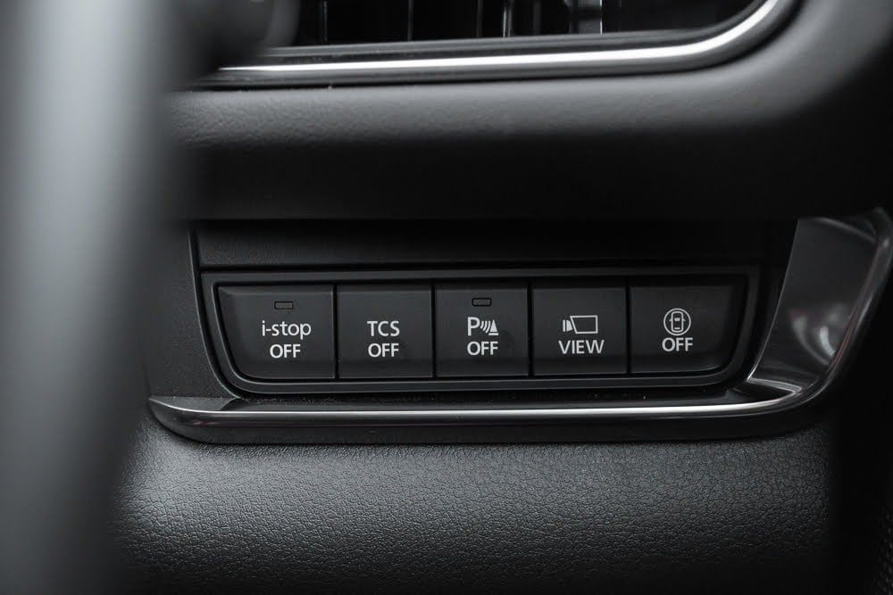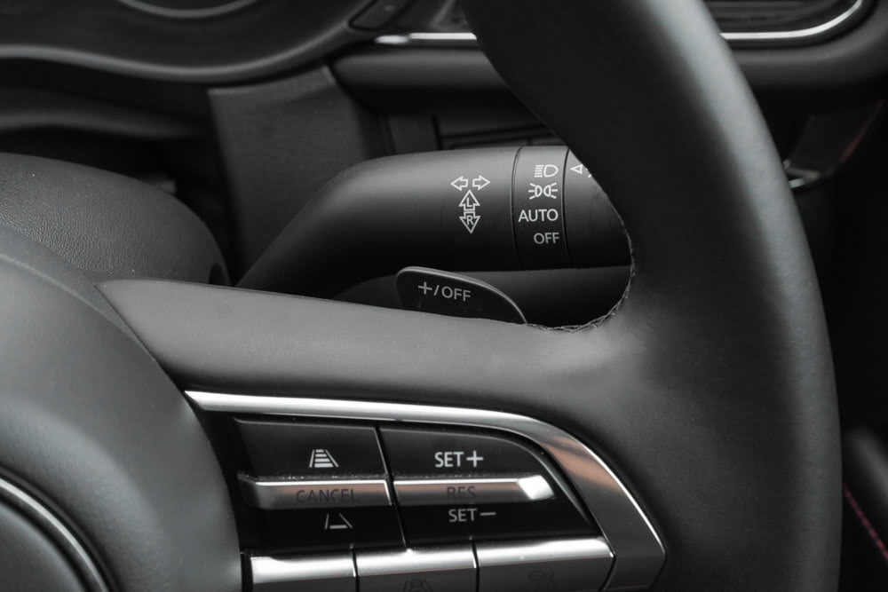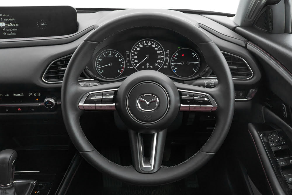 พวงมาลัยมัลติฟังก์ชั่น 3 ก้านเหมือน All New Mazda3 หุ้มหนังแท้ จับแล้วกระชับมือ คล่องมือดี ด้านขวาเป็นสวิตช์ปรับตั้งความเร็วอัตโนมัติ Adaptive Cruise Control ส่วนด้านซ้ายคือสวิตช์ปรับตั้งเครื่องเสียงและการเลือกโหมดต่างๆ ปุ่มรับหรือวางสายโทรศัพท์และปุ่มปรับจอภาพมาตรวัด TFT LCD ที่ปรับการแสดงผลได้ 3 รูปแบบ หลังวงพวงมาลัยมีแป้นเปลี่ยนเกียร์ Paddle Shift ทำจากพลาสติกสีดำ และสำหรับแผงหน้าปัดและมาตรวัดความเร็วแบบดิจิทัล TFT LCD ขนาด 7 นิ้ว หน้าจอแสดงข้อมูลการขับขี่แบบสีบนกระจกหน้าช่วยให้ผู้ขับขี่ไม่ต้องละสายตาจากถนน
