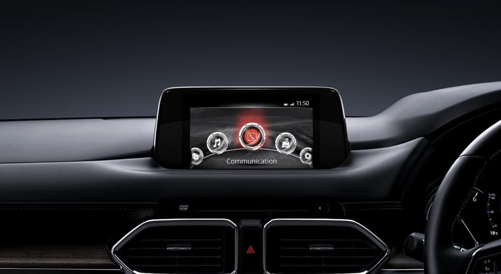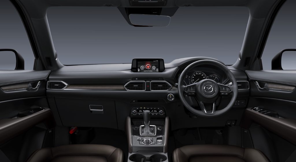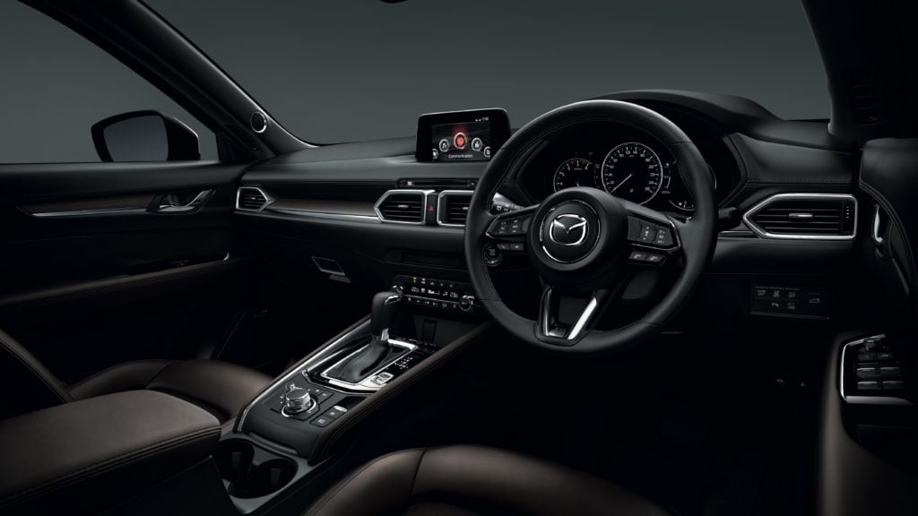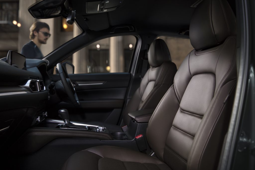 ภายในห้องโดยสารของ CX-5 ใหม่มีการเพิ่มความหรูหราด้วยการใช้โทนสีเข้ม เลือกใช้วัสดุแบบ Real Wood ผสมผสานกับสีเงินซาตินโครมในการตกแต่ง ติดตั้งเบาะหนัง Nappa สีแดง Deep Red พร้อมระบบระบายอากาศที่เบาะนั่งคู่หน้า Seat Ventilation มาตรวัดแบบความเร็วแบบดิจิตอล TFT LCD พร้อมจอแสดงผลแบบสี ขนาด 7 นิ้ว เชื่อมต่อแอพพลิเคชั่นบนสมาร์ทโฟนผ่าน Mazda Connect ที่รองรับ Apple CarPlay ได้แล้ว โดยแสดงข้อมูลผ่านหน้าจอสี Center Display แบบสัมผัส ขนาด 7 นิ้ว ปิดท้ายด้วยด้วยระบบเสียง Bose รอบทิศทาง