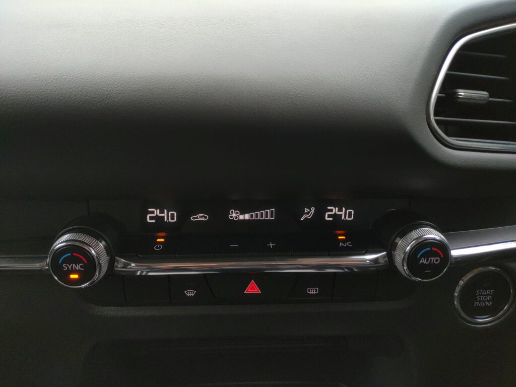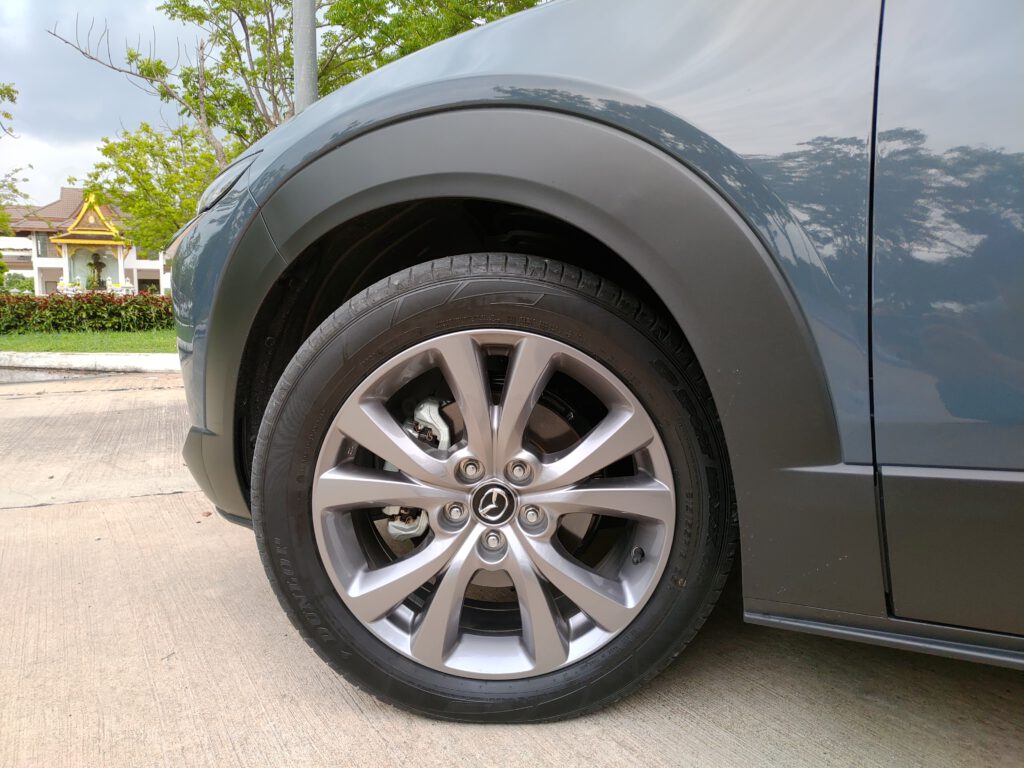 แป้นเบรกของ CX-30 มีระยะฟรีพอสมควร ในช่วงเหยียบแรกๆ รถจะยังไม่ค่อยหน่วง ต้องเพิ่มน้ำหนักลงอีกนิดนึงถึงจะรู้ว่าเริ่มหน่วง เบรกแบบนี้ข้อดีคือความนุ่มนวลที่ไม่ทำให้หน้าทิ่มแน่นอน แต่การใช้งานช่วงแรกต้องสร้างความคุ้นชินกับการกะจังหวะเบรก แล้วถ้ากระทืบแป้นเบรกล่ะ? มีจังหวะได้ลองอยู่ซึ่งเราพบว่าเบรกสามารถหยุดยั้งความเร็วจาก 100 กม./ชม. ลงมาสู่ความเร็วต่ำได้เวลาอันรวดเร็วโดยรถไม่เสียการควบคุม มั่นใจได้ว่าถ้าเบรกฉุกเฉินจริงๆ ก็เอาอยู่เพราะตัวช่วยต่างๆ ก็มีครบทั้ง ABS, EBD และ BA