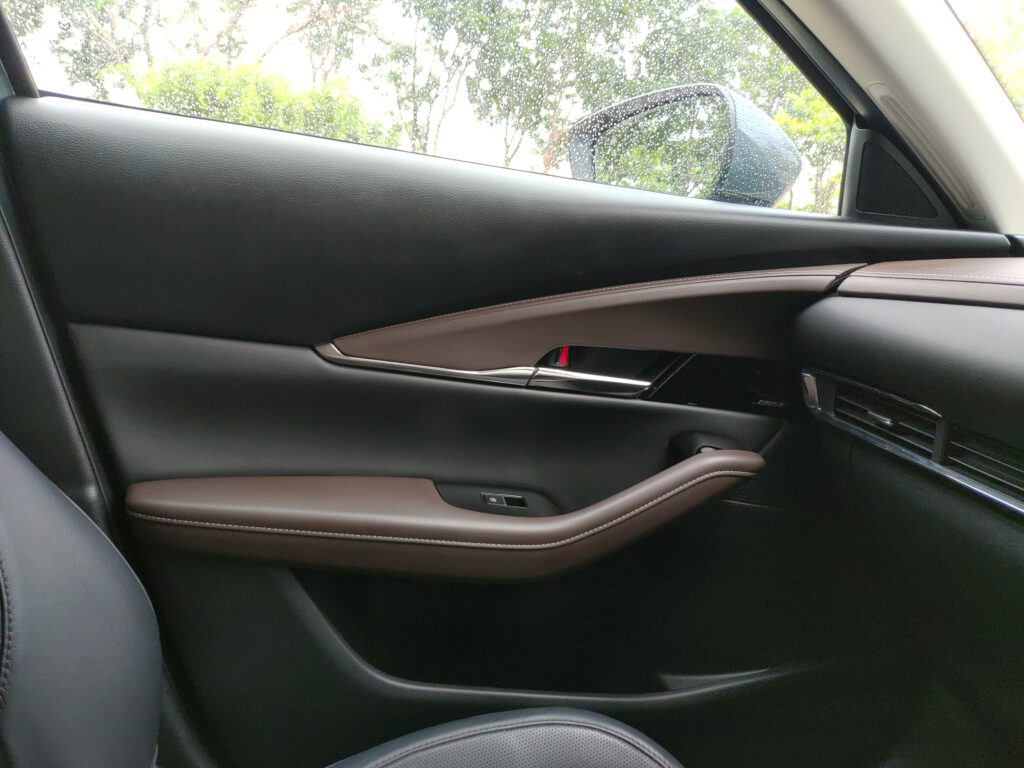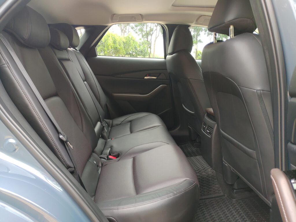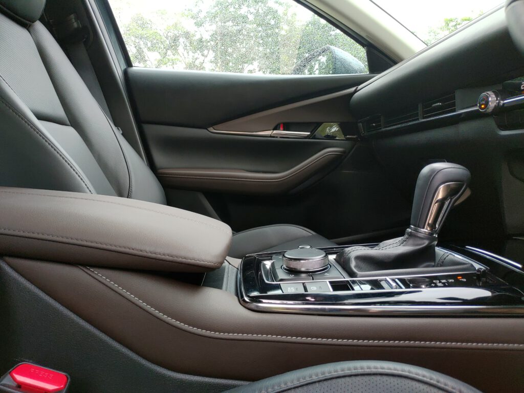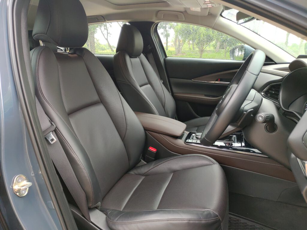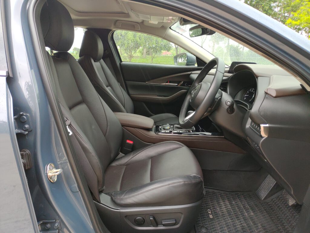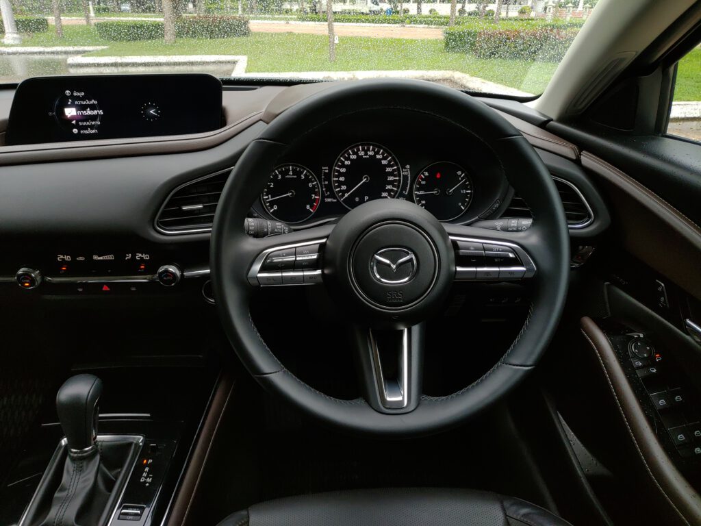 เราจำความรู้สึกขณะนั่งขับในรถ Mazda 3 ได้แม่น ทุกอย่างรอบตัวดูกระชับ ท่านั่งสปอร์ตต่ำติดพื้น พื้นที่ตอนหน้าไม่มีปัญหาแต่เบาะหลังแคบ พอมานั่งใน CX-30 ที่ยกเอารูปแบบดีไซน์ทุกอย่างของ Mazda 3 มาใช้ในขนาดห้องโดยสารที่ใหญ่ขึ้น มันรู้สึกได้เลยว่าสบายตัวขึ้น ทัศนวิสัยการมองรอบตัวรถดีขึ้นจากความสูงของเบาะนั่งที่มากขึ้น มุมมองด้านหน้ารถกว้างไกลขึ้น เสา A-pillar ไม่บดบังการมองตรงบริเวณมุมรถจนเกินไป อย่างไรก็ตามมุมมองผ่านไหล่ไปกระจกหลังยังแคบอยู่เหมือนเดิม