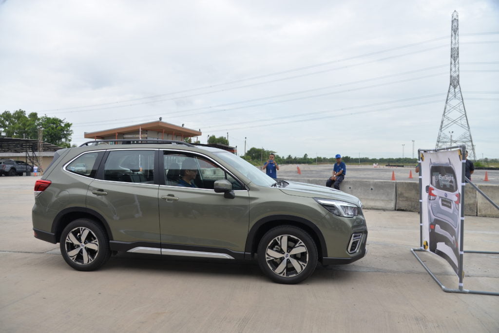 ต่อมาเป็นสถานีทดสอบระบบเบรกอัตโนมัติล่วงหน้าก่อนการชน Pre-Collision Braking System ระบบนี้ถือเป็นไฮไลท์และช่วยลดอุบัติเหตุได้ดีที่สุด เมื่อกล้อง Eyesight ตรวจพบว่ามีวัตถุหรือรถคันหน้าที่เสี่ยงต่อการชน ระบบจะส่งเสียงพร้อมไฟกระพริบเตือนก่อน หากผู้ขับยังไม่เบรก ระบบจะเบรกให้เองโดยอัตโนมัติ เราทดลองปล่อยคันเร่งให้รถไหลเข้าสิ่งกีดขวางและไม่กดเบรก ระบบส่งเสียงเตือน ก่อนจะค่อยๆ เบรกให้อย่างนุ่มนวลจนรถหยุดนิ่ง ซูบารุบอกว่าในความเร็วไม่เกิน 60 กม./ชม. ระบบจะทำงานได้เต็มประสิทธิภาพ 100% หากเกินกว่านั้นอาจจะเบรกไม่พ้นแต่ก็ช่วยผ่อนหนักเป็นเบาได้ในระดับนึง