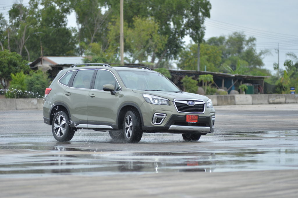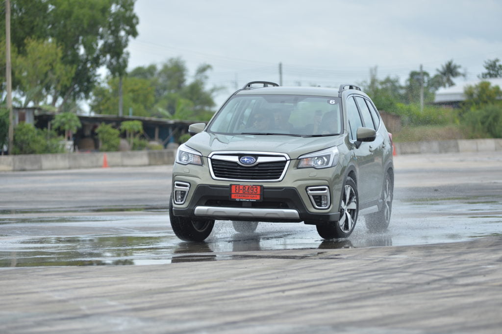 ต่อมาเป็นการขับวนเป็นวงกลมบนพื้นผิวเปียกโดยใช้ความเร็ว 30-40 กม./ชม. เพื่อทดสอบการยึดเกาะและการตอบสนองของช่วงล่าง Forester ให้ผลลัพธ์ที่น่าพอใจ ระบบช่วยต่างๆ ร่วมกันทำงานเพื่อป้องกันไม่ให้รถลื่นไถล ซึ่งตรงนี้เราไม่พบอาการท้ายปัดเลย รถอยู่ในการควบคุมและยึดเกาะพื้นถนนได้ดี หากหน้าดื้อก็ยกคันเร่งเล็กน้อยจะช่วยให้บังคับพวงมาลัยได้ง่ายขึ้น