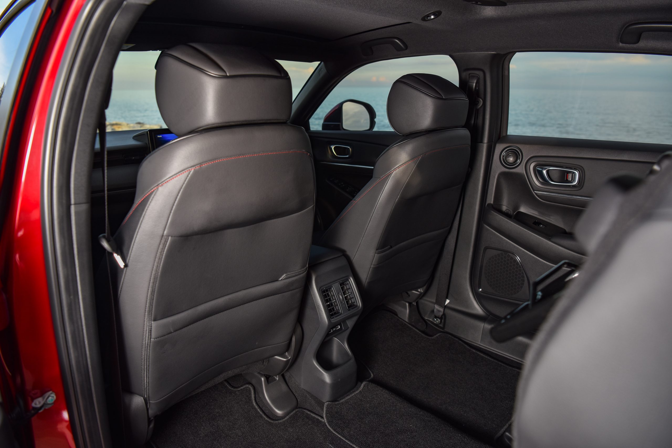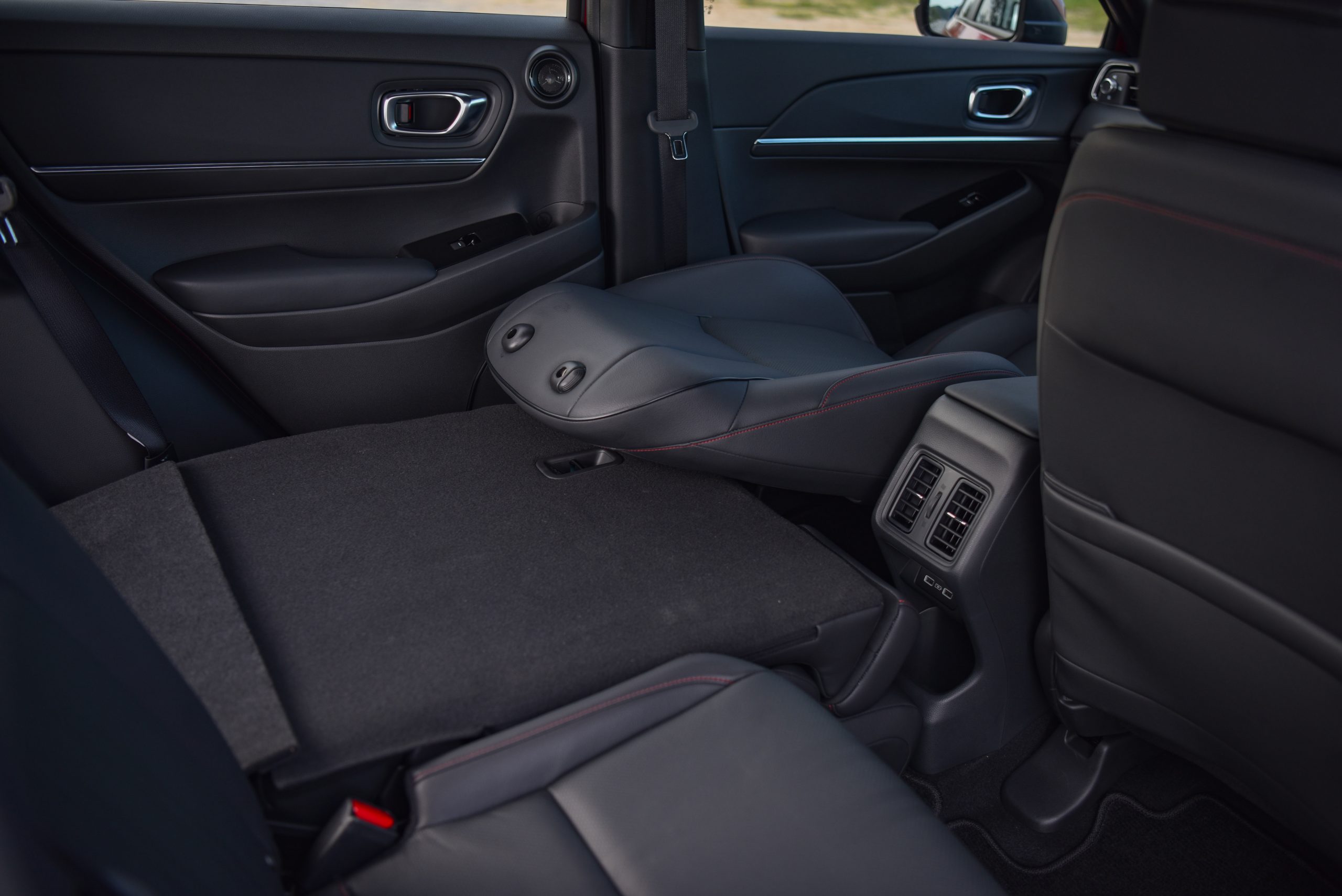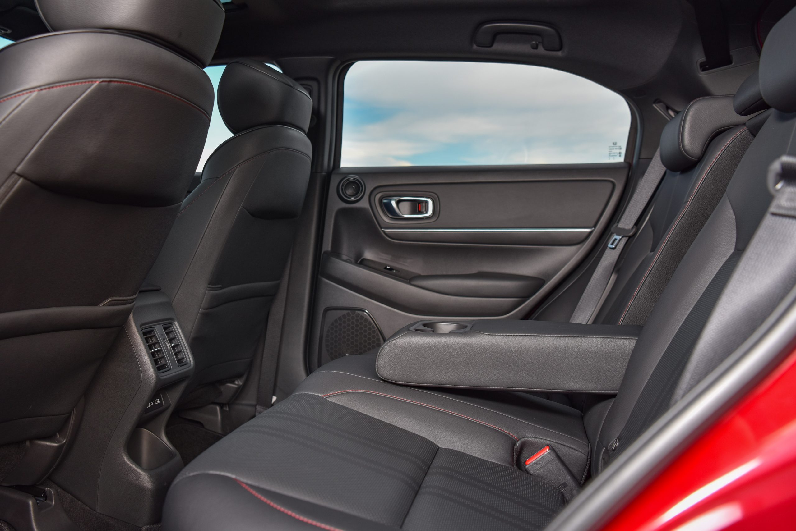 อีกฟีเจอร์หนึ่งก็คือระบบปรับอกาศของ Honda HR-V eHEV เป็นระบบ Air Diffusion System ตัวปรับองศาของลมแบบใหม่มี 2 ระดับ ปรับแบบหมุนให้ตรงและหมุนแบบให้กระจายเป็นลมโกรก หมุนเวียนอยู่รอบรถก็จะทำให้รถมีความเย็นที่ทั่วถึงและที่สำคัญคือแอร์ไม่ปะทะมือทำให้ไม่ต้องปรับองศาแอร์เลย แค่หมุน Diffusion ก็จบ ซึ่งเป็นแบบแยกอิสระซ้ายขวา ที่นั่งข้างคนขับก็มีเช่นกันซึ่งสามารถปรับได้ตามความต้องการและมาพร้อมด้วยช่องปรับอากาศตอนหลัง (เฉพาะรุ่น e:HEV EL และรุ่น e:HEV RS) จึงช่วยให้ภายในห้องโดยสารเย็นทั่วถึง แม้ว่าจะรู้สึกอุ่นที่ด้านบนหลังคาบ้างก็ตาม