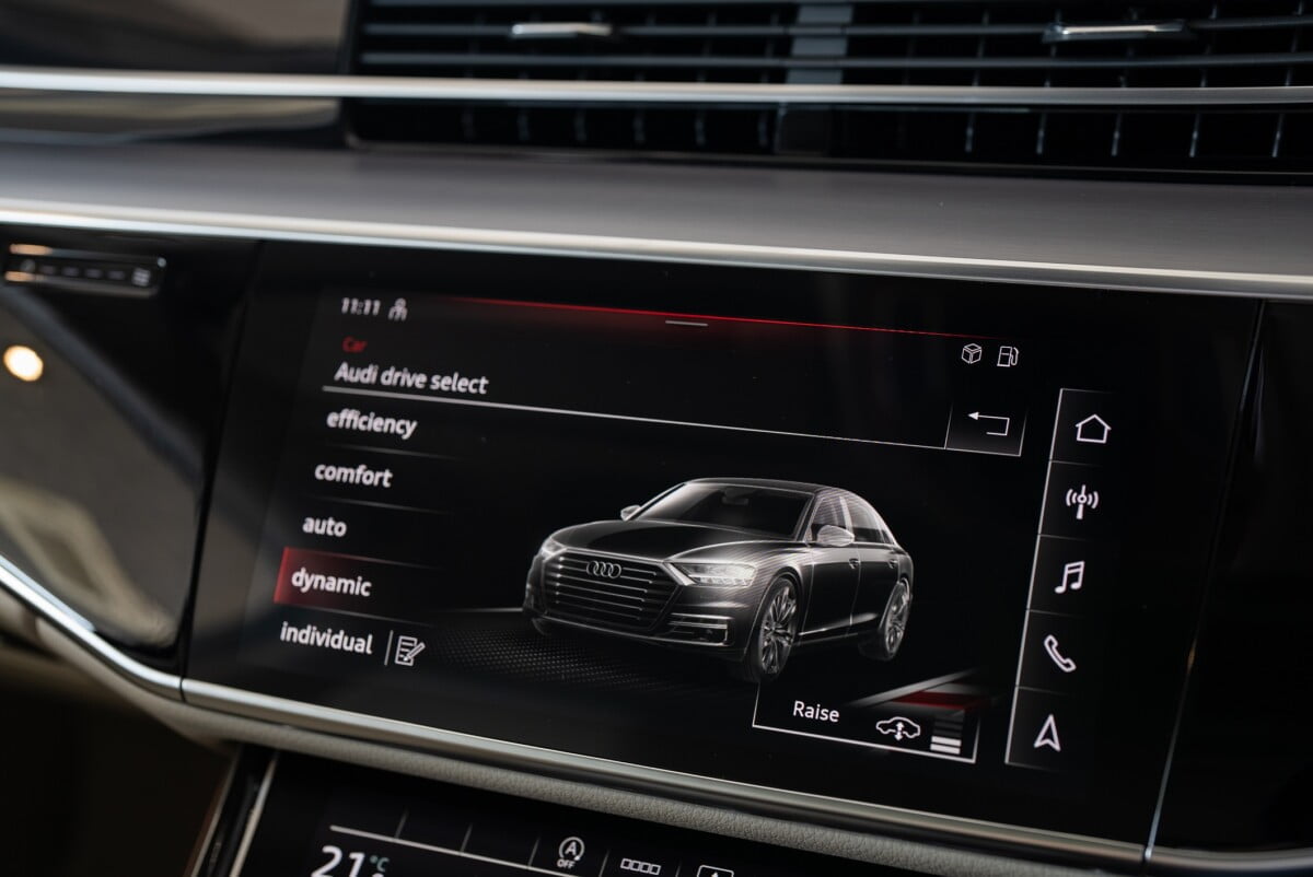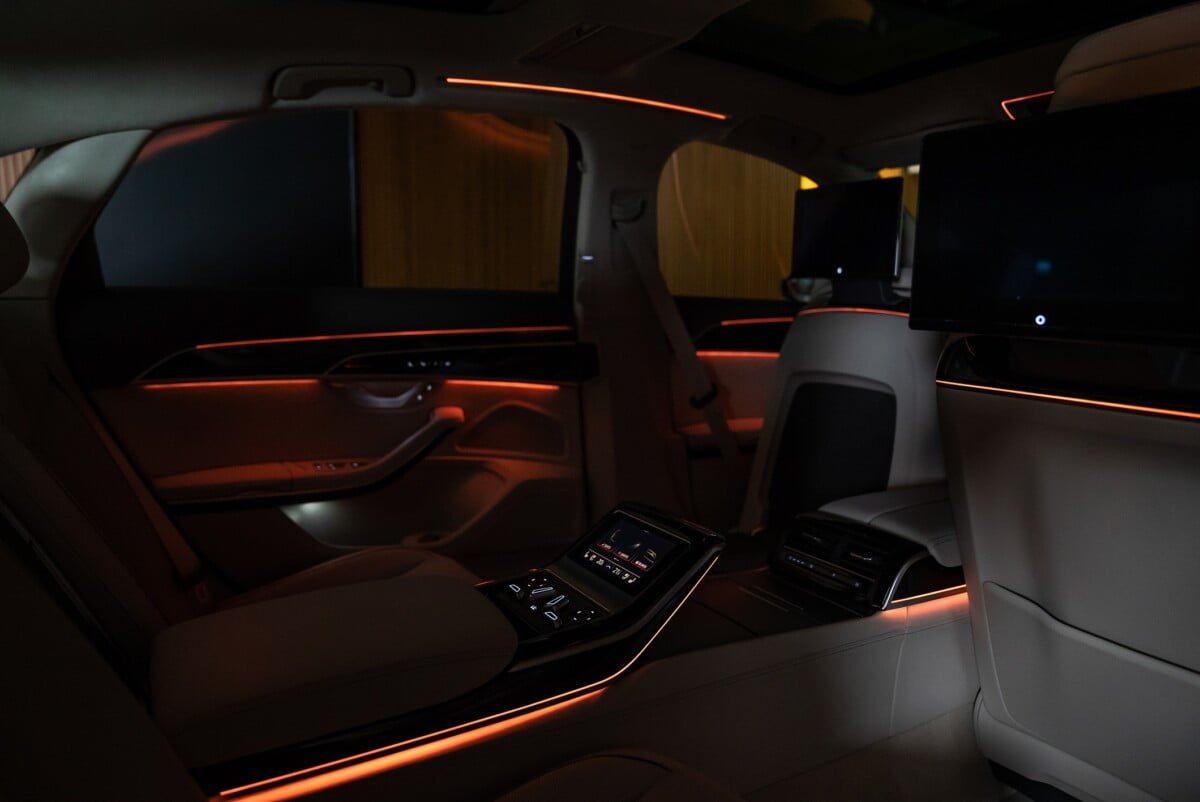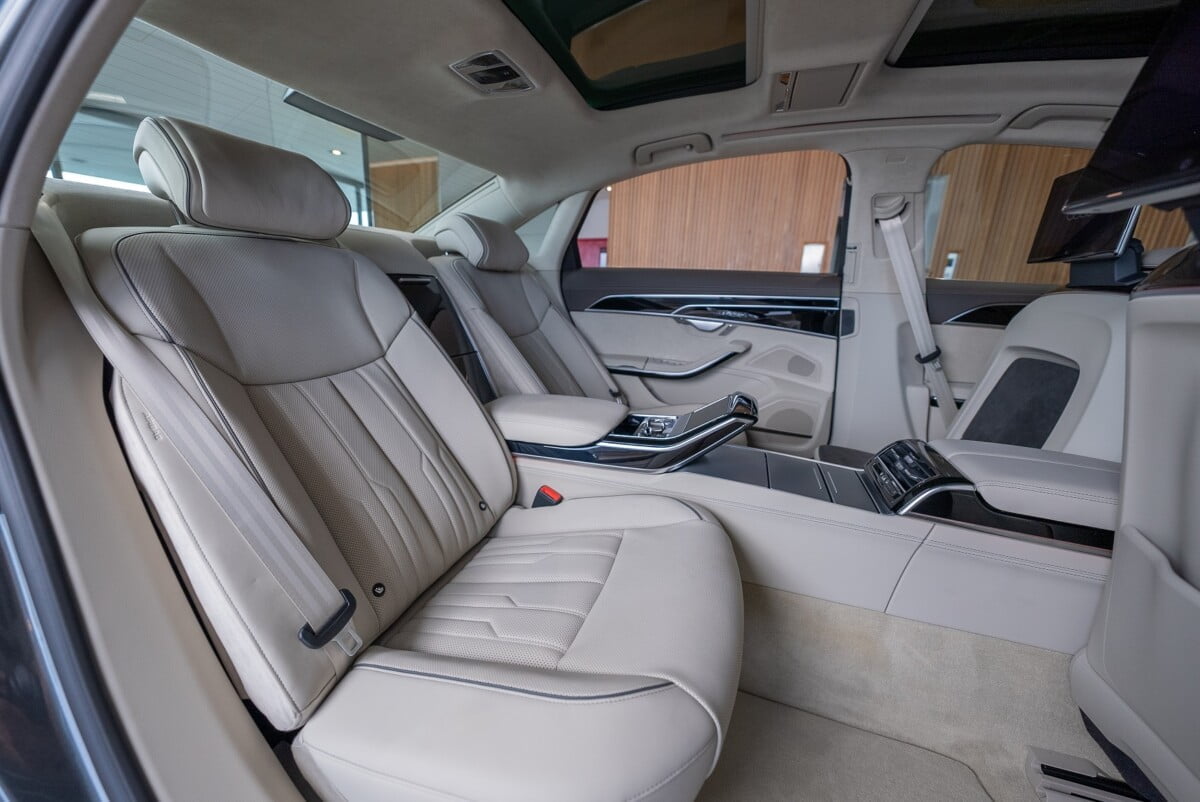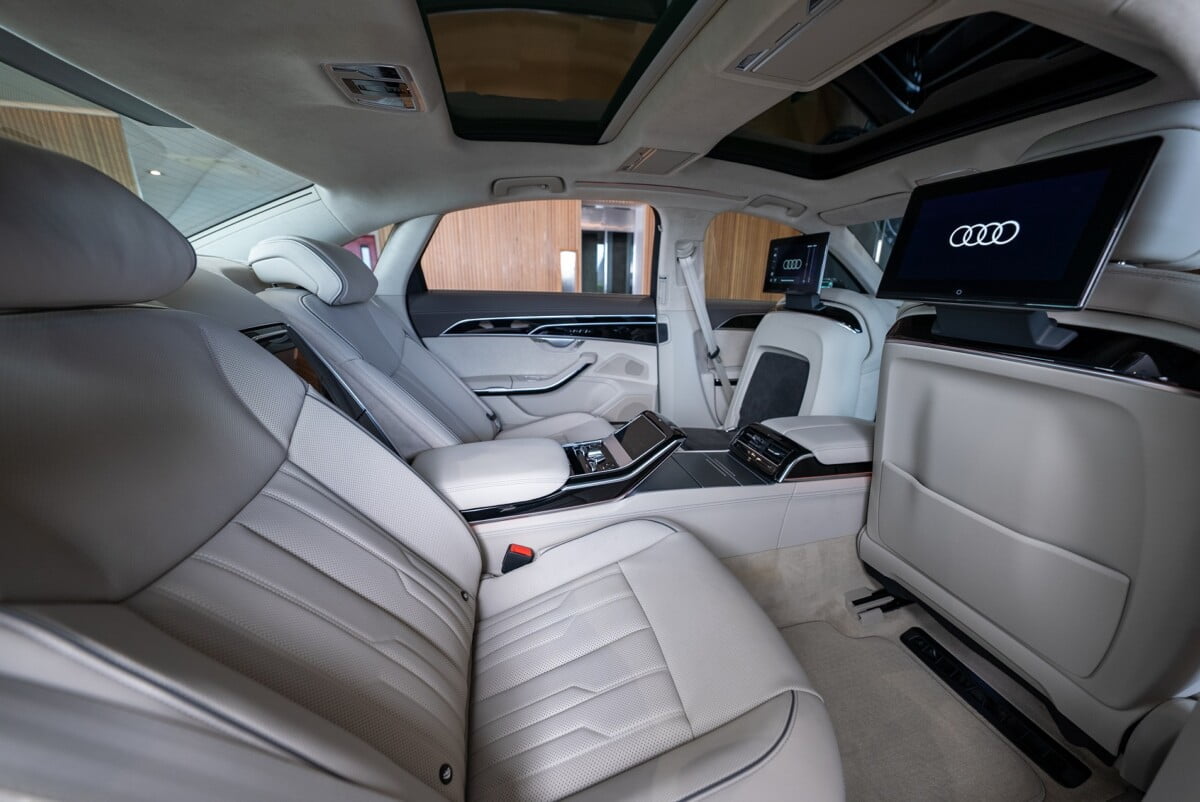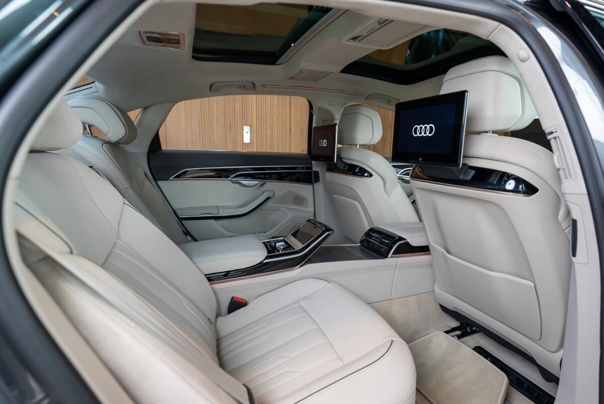 นอกจากนี้ยังมีจอแสดงผล 2 ตำแหน่ง Full HD แบบแยกอิสระ ที่ผู้โดยสารจะเพลิดเพลินกับระบบ streaming ต่างๆ โดยการเชื่อมต่ออินเตอร์เน็ต นอกจากนั้นแอร์หลังยังเป็นแบบ 4 โซน ซึ่งสามารถควบคุมผ่านจอ Tablet แบบ OLED ขนาด 5.7 นิ้ว เพิ่มความนุ่มสบายด้วยวัสดุคุณภาพสูง โดยเฉพาะหนัง แบบ Valetta ในรุ่น Premium และหนัง Valcona ในรุ่น Prestige S line ซึ่งในรุ่น The New Audi A8 L นี้ มีสีภายในสีใหม่เข้ามา คือสี Cognac brown ที่เพิ่มความพรีเมียมให้กับตัวรถมากขึ้น