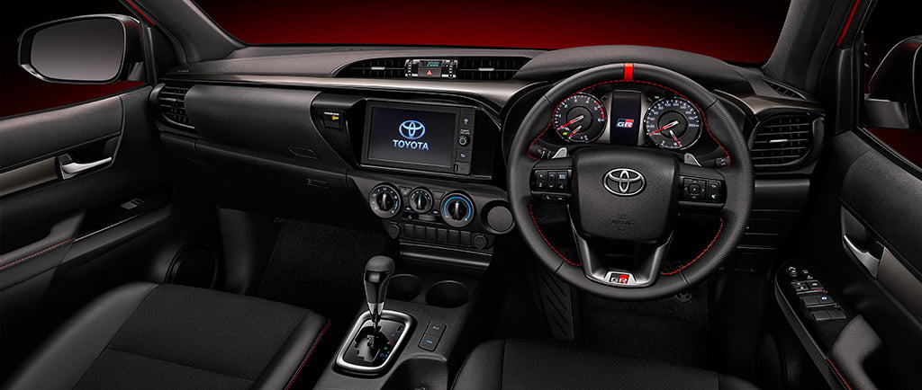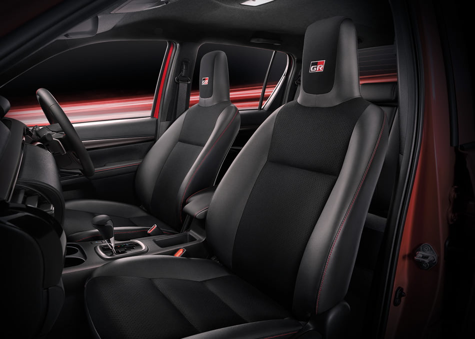 ด้านภายในห้องโดยสารของ Toyota Hilux Revo GR SPORT 2021 ทั้งรุ่นยกสูงขับเคลื่อน 4 และรุ่นโหลดเตี้ยขับเคลื่อน 2 ล้อ มาในดีไซน์สปอร์ต แต่ยังให้ความแกร่ง พร้อมรับในทุกสถานการณ์ มาพร้อมกับเบาะนั่งหนัง Suede แบบเจาะรู และหนังสังเคราะห์สไตล์สปอร์ตสีดำสลับแดง ตกแต่งด้วยด้ายสีแดง โอบกระชับสรีระ พร้อมสัญลักษณ์ GR สามารถปรับยกเบาะเพื่อเพิ่มพื้นที่เก็บของ 60/40 แผงคอนโซลหน้าและช่องปรับอากาศด้านหน้าสี Smoke Silver และสีดำเมทัลลิก เพิ่ม Paddle Shift ซึ่งเป็นครั้งแรกใน Hilux Revo เพื่อเพิ่มความเร้าใจในการขับขี่ พวงมาลัยสามารถปรับระดับได้ 4 ทิศทาง มาพร้อมกับการหุ้มหนังและตกแต่งด้วยแถบสีแดง และด้ายสีแดง หรือ สี Smoke silver พร้อมกับสัญลักษณ์ GR และมีสวิตซ์ควบคุมเครื่องเสียง โทรศัพท์ และจอสี TFT บนพวงมาลัย หัวเกียร์หุ้มหนังตกแต่งด้วยสี Smoke silver แป้นคันเร่ง และเบรคดีไซน์สปอร์ตสร้างความเร้าใจ มาตรวัดเรืองแสงแบบ Optitron สีขาว ดีไซน์เฉพาะรุ่น GR Sport จอแสดงข้อมูลการขับขี่เป็นจอสีแบบ TFT แสดงข้อมูลคมชัด สวยงาม พร้อมสัญลักษณ์ GR