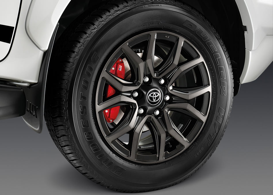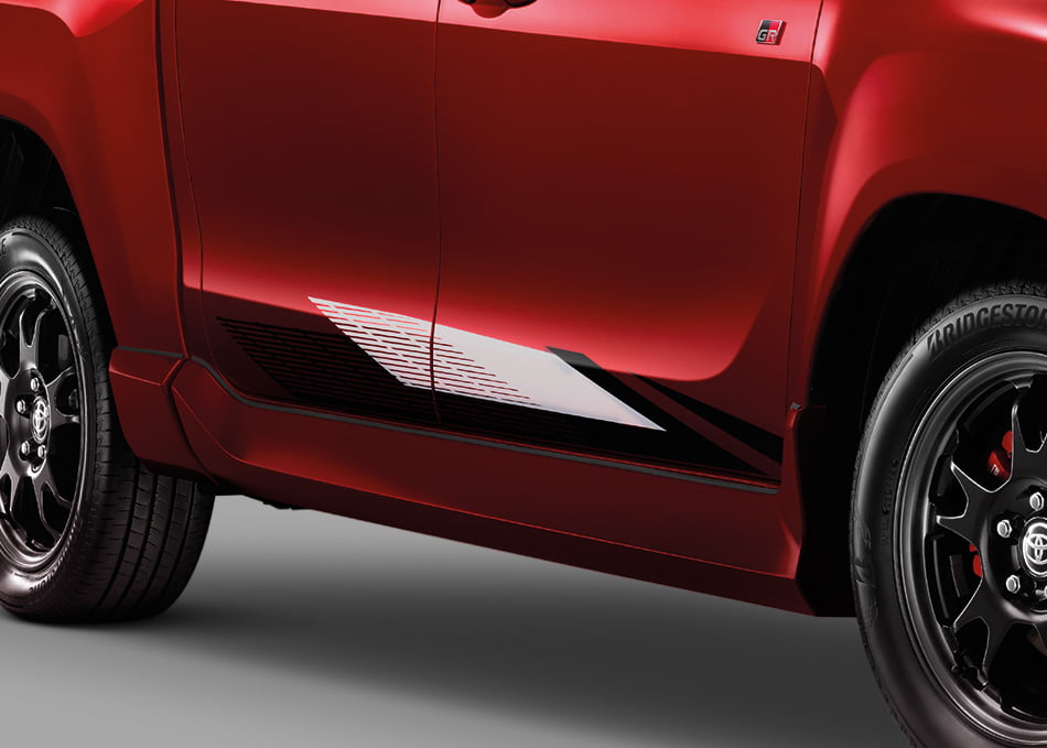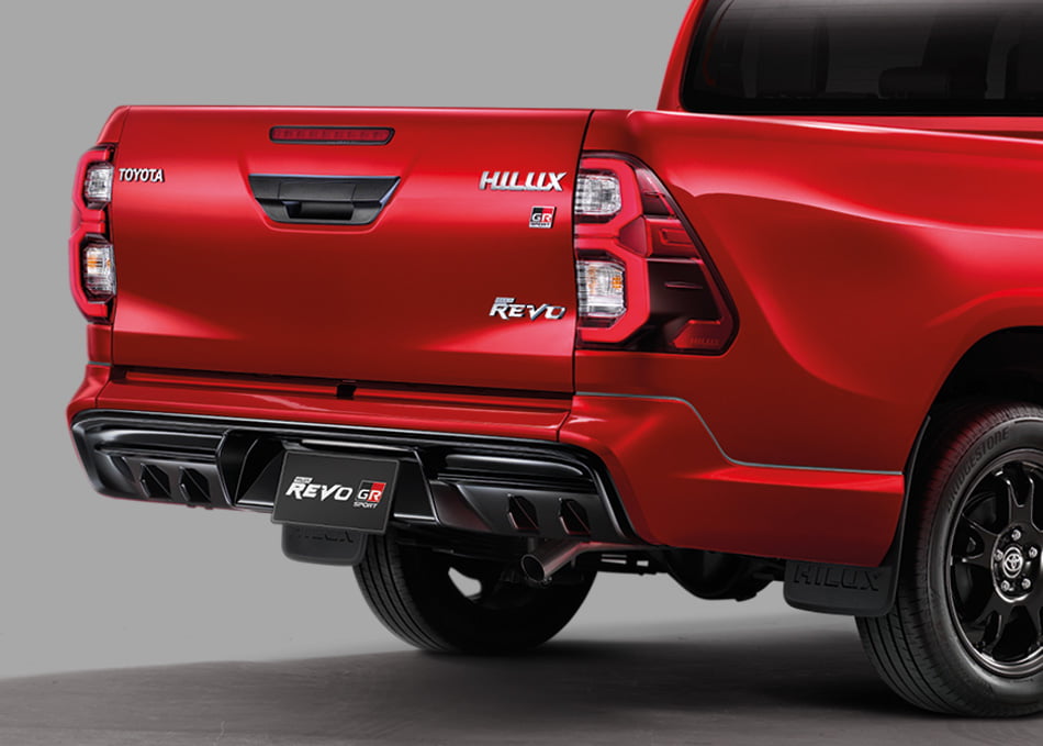 และในรุ่นโหลดเตี้ยขับเคลื่อน 2 ล้อ ติดตั้งกระจังหน้าและกันชนสีเดียวกับตัวรถ และสีดำเมทัลลิก ในส่วนของกระจังหน้ามาพร้อมสัญลักษณ์ GR กันชนมาพร้อมชุดตกแต่ง สเกิร์ตรอบคันดีไซน์ดูสปอร์ตโฉบเฉี่ยว กระจกมองข้างสีดำเมทัลลิก ปรับและพับเก็บด้วยไฟฟ้าพร้อมไฟเลี้ยวรุ่น GR Sport ไฟหน้าแบบ Bi-Beam LED พร้อมระบบควบคุมการเปิด- ปิด ไฟหน้าอัตโนมัติพร้อมระบบ Follow-me-home และ ไฟท้ายแบบ LED Light guiding สติ๊กเกอร์ด้านข้างกระบะพร้อมสัญลักษณ์ดีไซน์เฉพาะรุ่น GR Sport และล้ออัลลอย 17 นิ้ว ดีไซน์พิเศษโดดเด่นด้วยเบรกคาลิปเปอร์สีแดง และสัญลักษณ์ GR