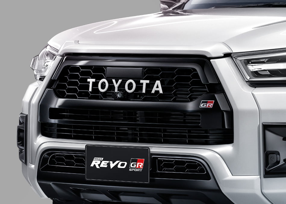 Toyota Hilux Revo GR SPORT 2021 ในรุ่นยกสูงขับเคลื่อน 4 ล้อ ติดตั้งกระจังหน้าและกันชนหน้าสีเดียวกับตัวรถ และสีดำเมทัลลิก ในส่วนของกระจังหน้ามาพร้อมกับตัวหนังสือ Toyota และสัญลักษณ์ GR และมีดีไซน์ใหม่เป็นทรงหกเหลี่ยม ส่วนกันชนหน้ามาพร้อมกับชุดแต่งกันชนหน้า กันชนหลังเป็นสีดำเมทัลลิก กระจกมองข้างสีดำเมทัลลิก ปรับและพับเก็บด้วยไฟฟ้า พร้อมไฟเลี้ยวและระบบ Welcome Light สปอร์ตบาร์พร้อมไฟส่องสว่างแบบ LED และพื้นปูกระบะสีดำเมทัลลิก ดีไซน์เฉพาะรุ่น GT Sport ไฟหน้าแบบ Bi-Beam LED พร้อมระบบควบคุมการเปิด- ปิด ไฟหน้าอัตโนมัติพร้อมระบบ Follow-me-home และไฟท้ายแบบ LED Light guiding มีอุปกรณ์ผ่อนแรงเปิด-ปิดฝาท้ายกระบะพร้อมสัญลักษณ์ GR Sport สติ๊กเกอร์ด้านข้างและท้ายกระบะพร้อมสัญลักษณ์ ดีไซน์เฉพาะรุ่น GT Sport ล้ออัลลอยด์ 18 นิ้ว ดีไซน์พิเศษโดดเด่นด้วยเบรกคาลิปเปอร์สีแดง และสัญลักษณ์ GR